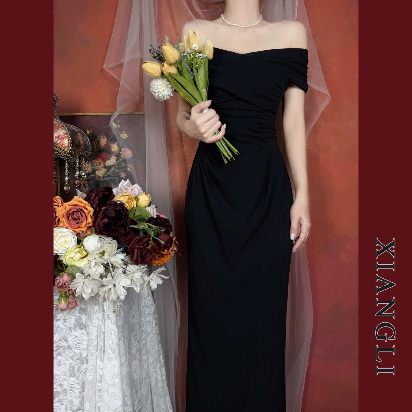 巷里法式 一字肩黑色连衣裙秋冬赫本显瘦气质开叉高级感小礼服长裙