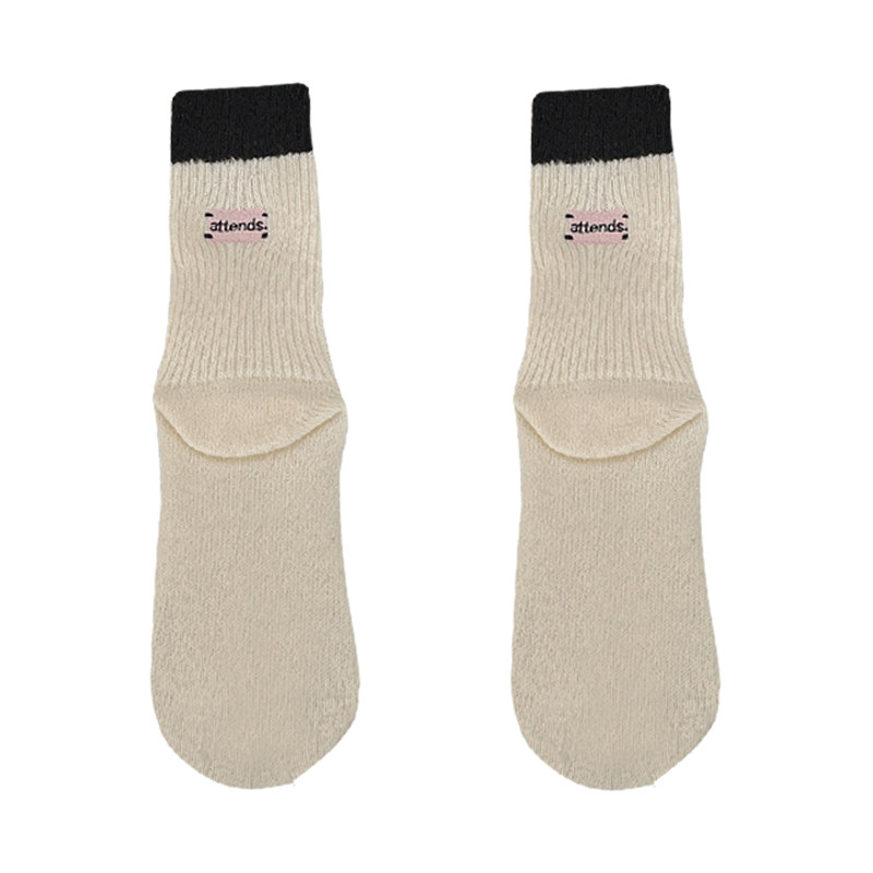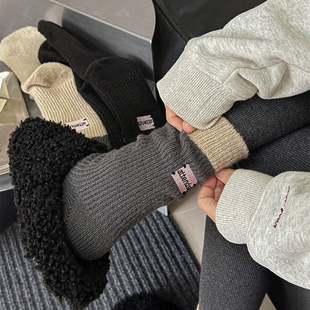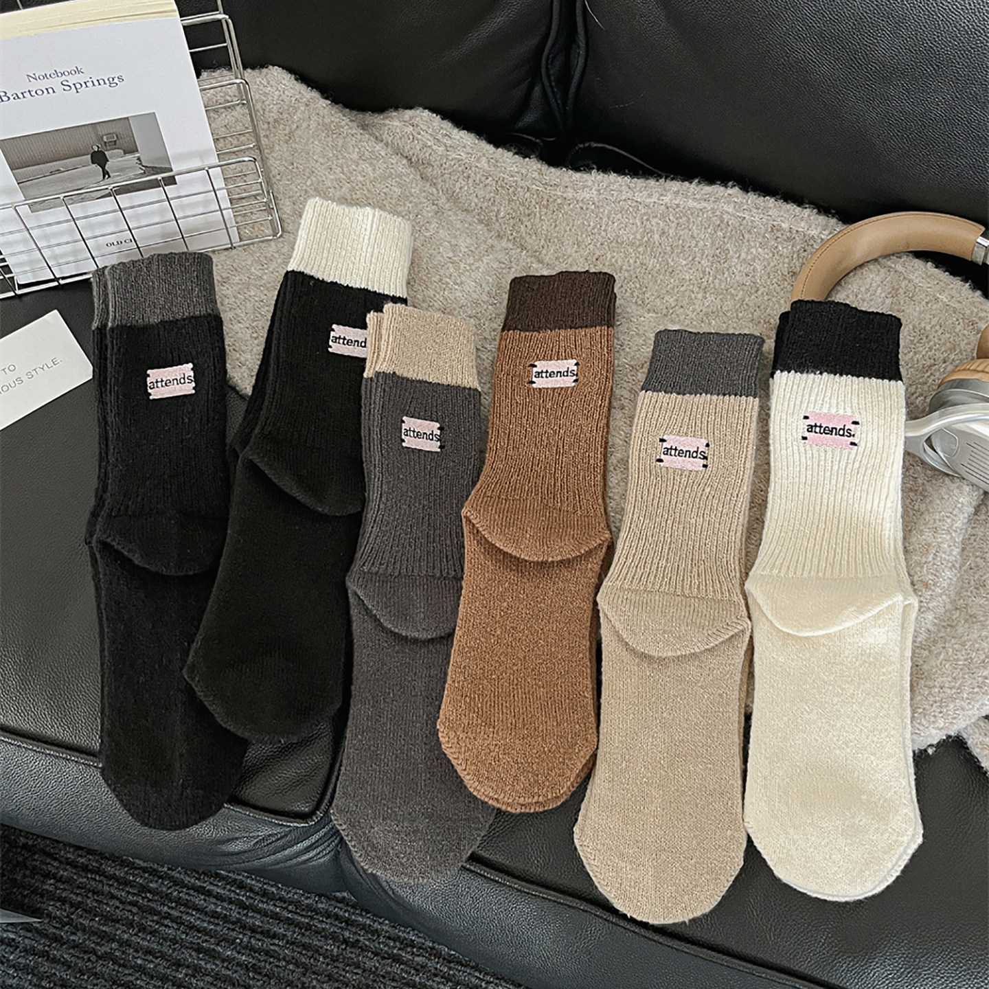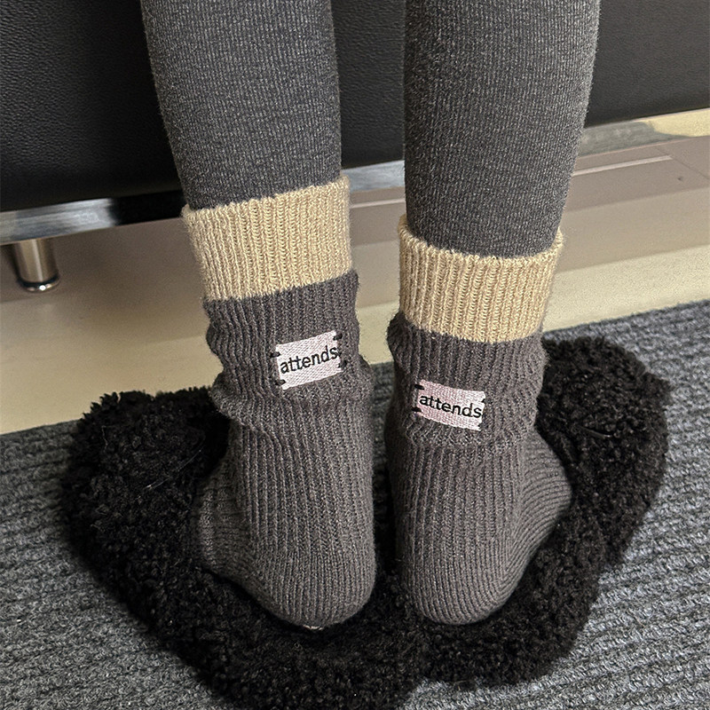 网红加厚保暖羊绒袜子女中筒袜ins潮搭毛拖鞋 后跟标拼色长筒袜