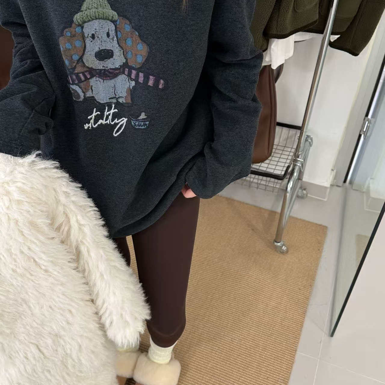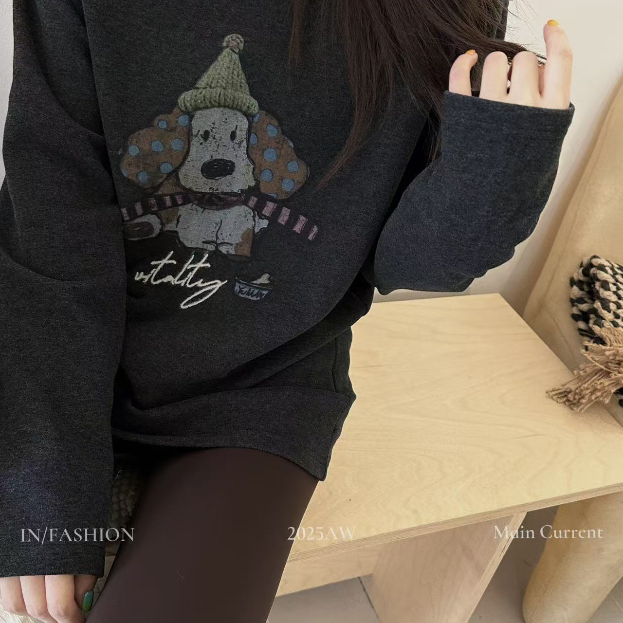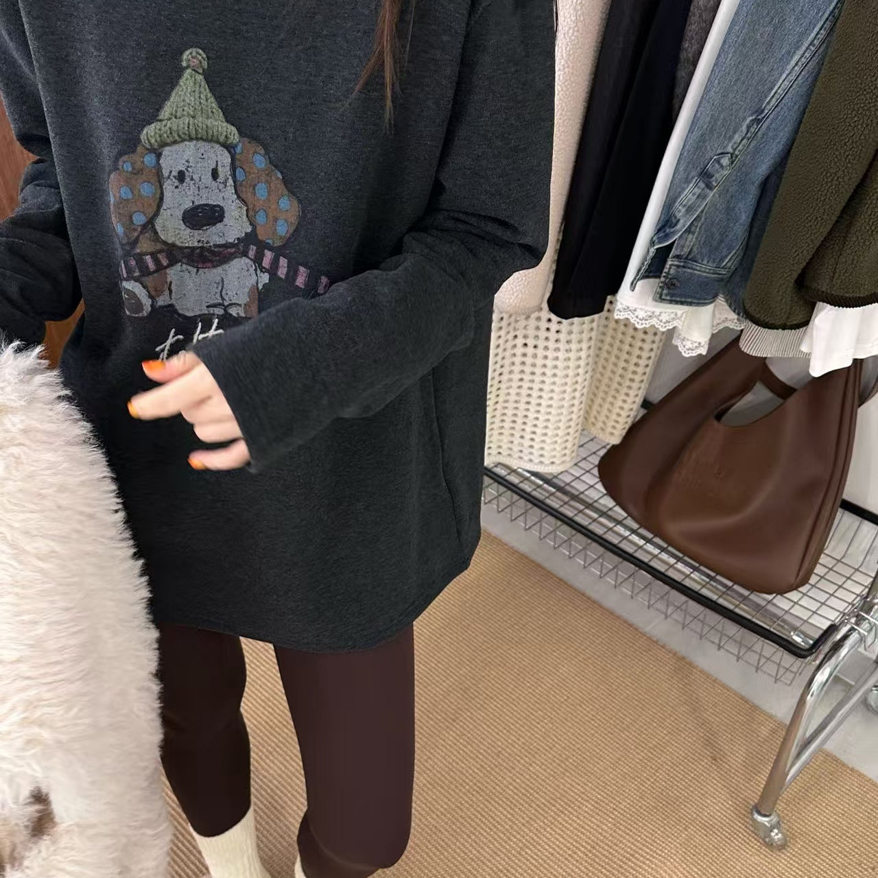 磨毛德绒加厚保暖长棉绒卡通印花打底衫 深灰色磨毛长袖 T恤女冬季