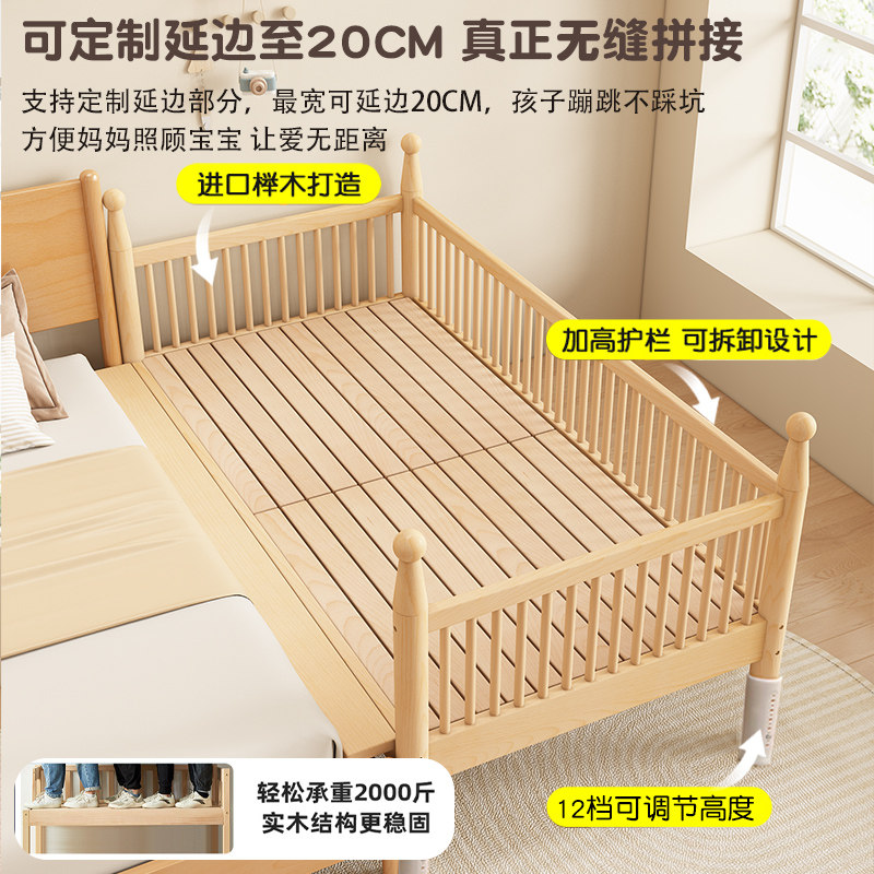 榉木儿童床拼接床婴儿床加宽宝宝床边床拼接大床实木床带护栏小床