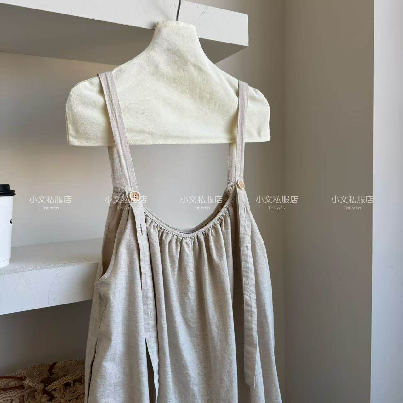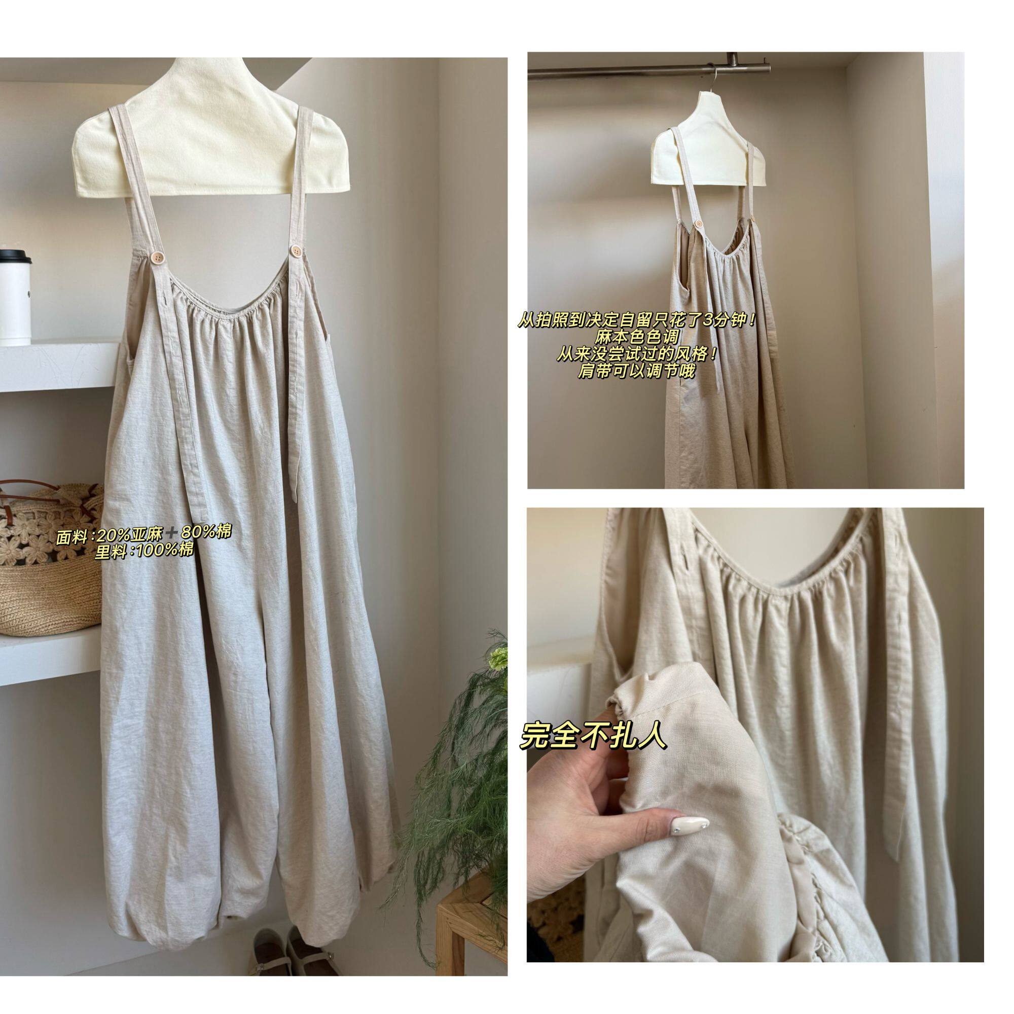 6804 轻薄慵懒松弛舒适亚麻直筒连体裤 夏莫卡黑色背带裤 女2026新款