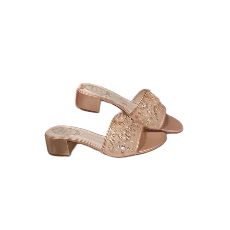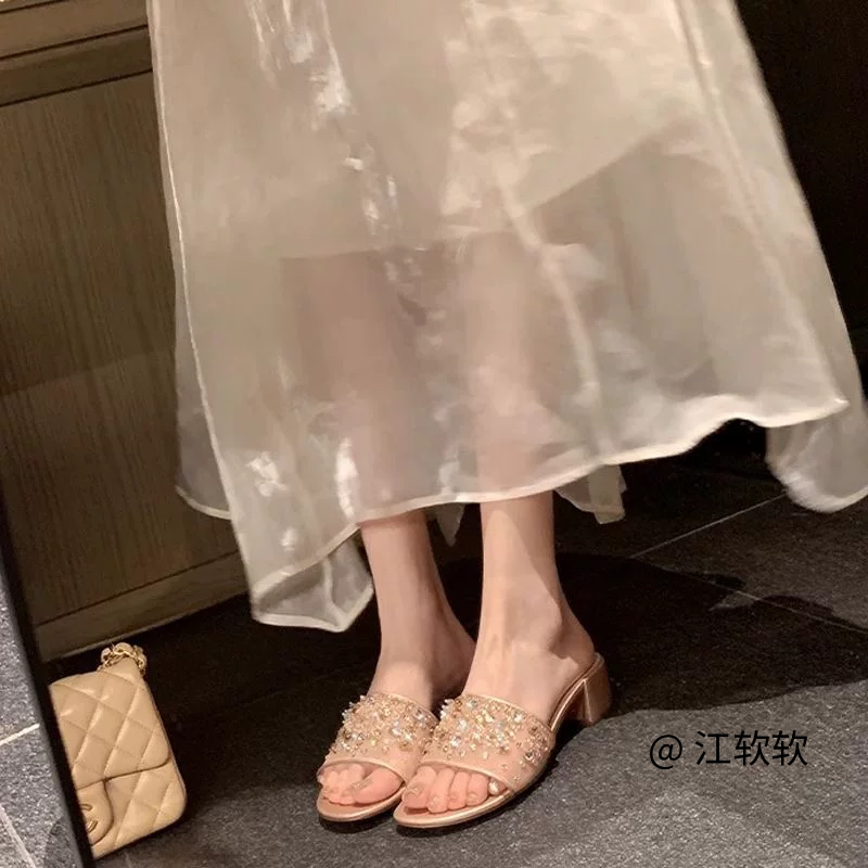 网纱水钻一字粗跟拖鞋 水晶拖 女凉拖晚宴外穿千金 葡萄妈同款