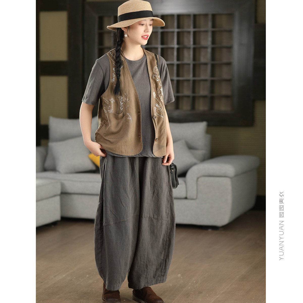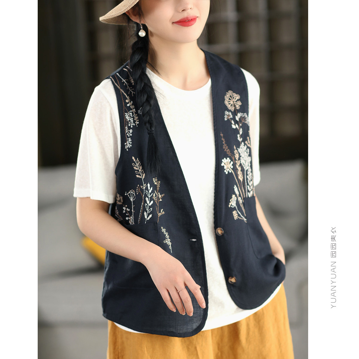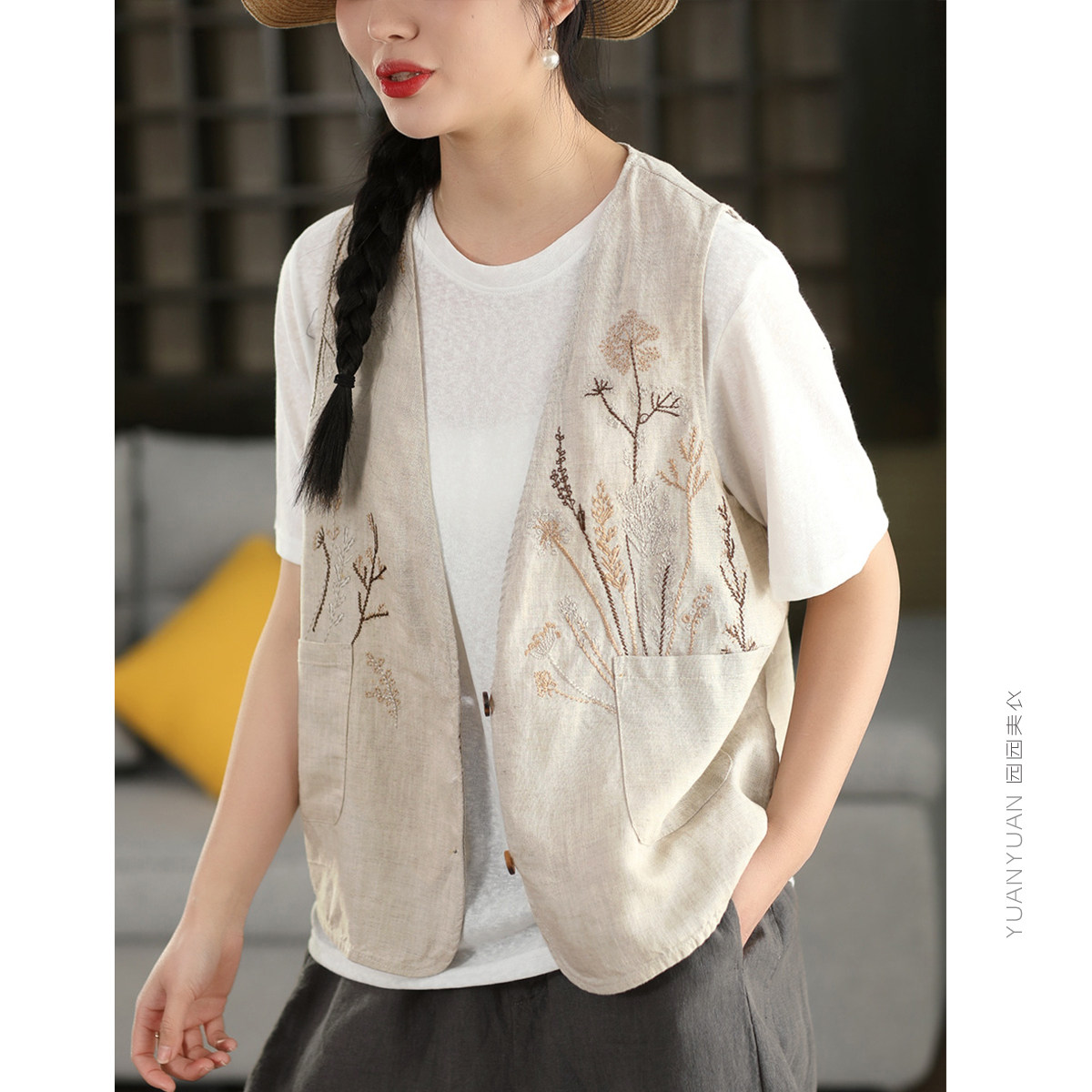 园园美衣复古重工刺绣100%亚麻马甲外套春夏气质绣花无袖 马夹上衣