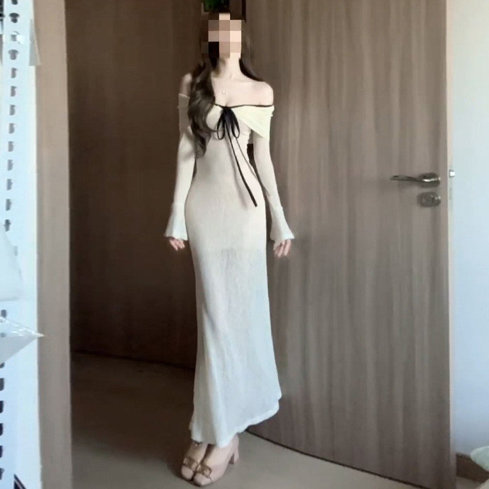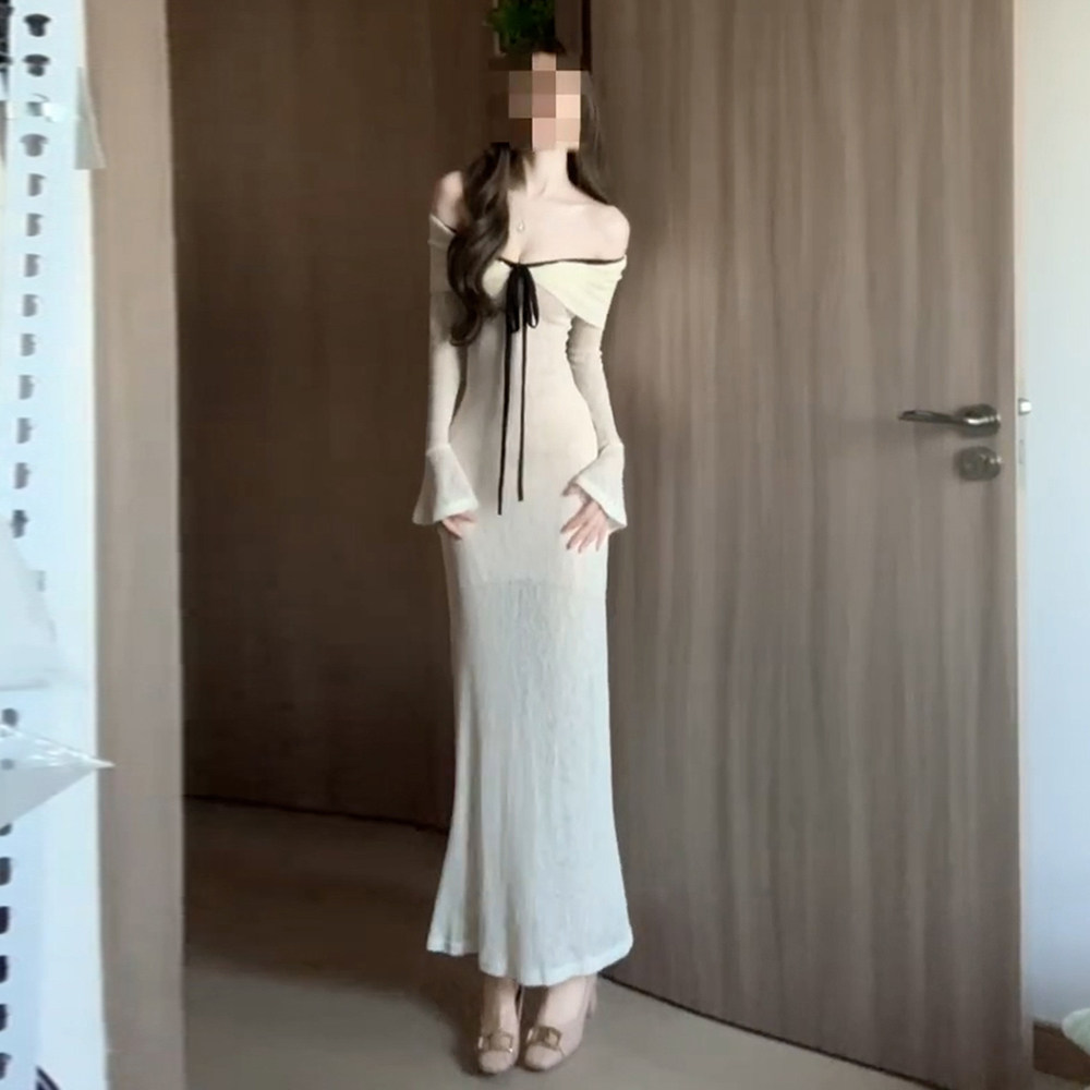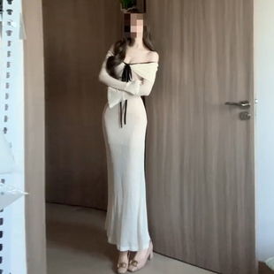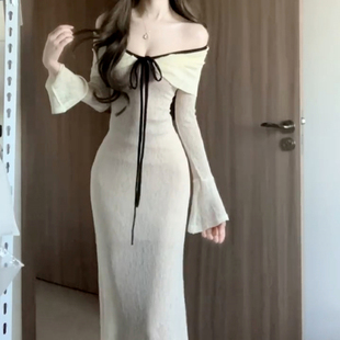 设计感气质收腰包臀长裙 连衣裙女早秋修身 法式 一字肩辣妹露肩长袖