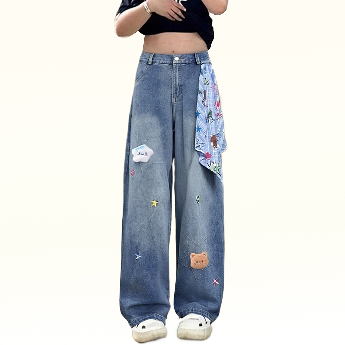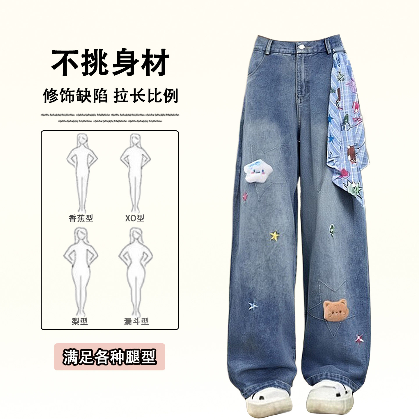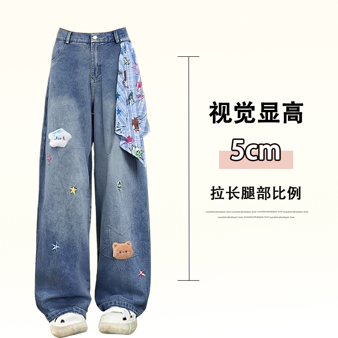 女辣妹风星星刺绣阔腿裤 胖mm大码 高街学院风蓝色牛仔裤 美式 子 女装