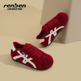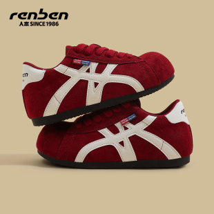内增高轻便软底设计感运动板鞋 人本红色德训鞋 新款 2026春秋季 女款