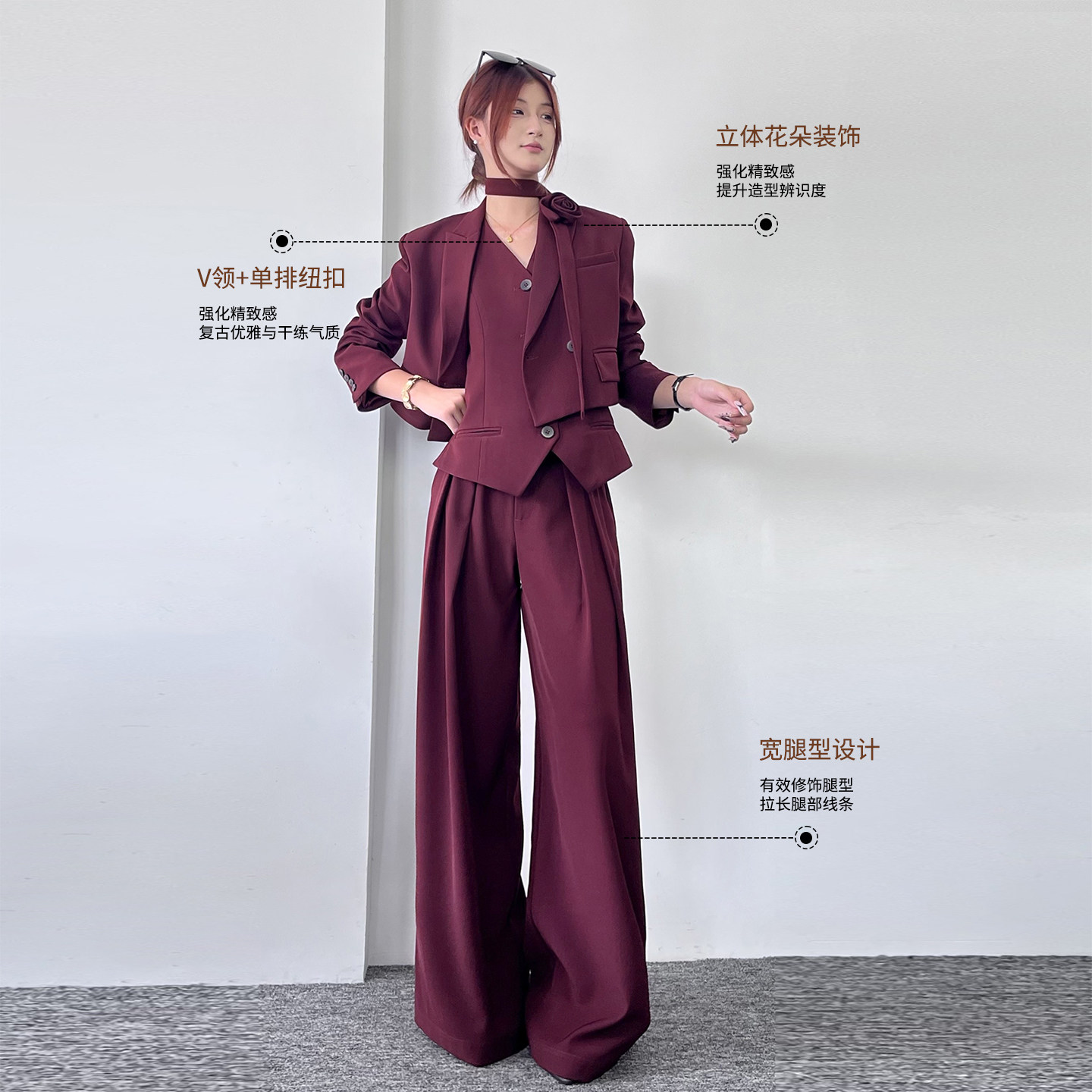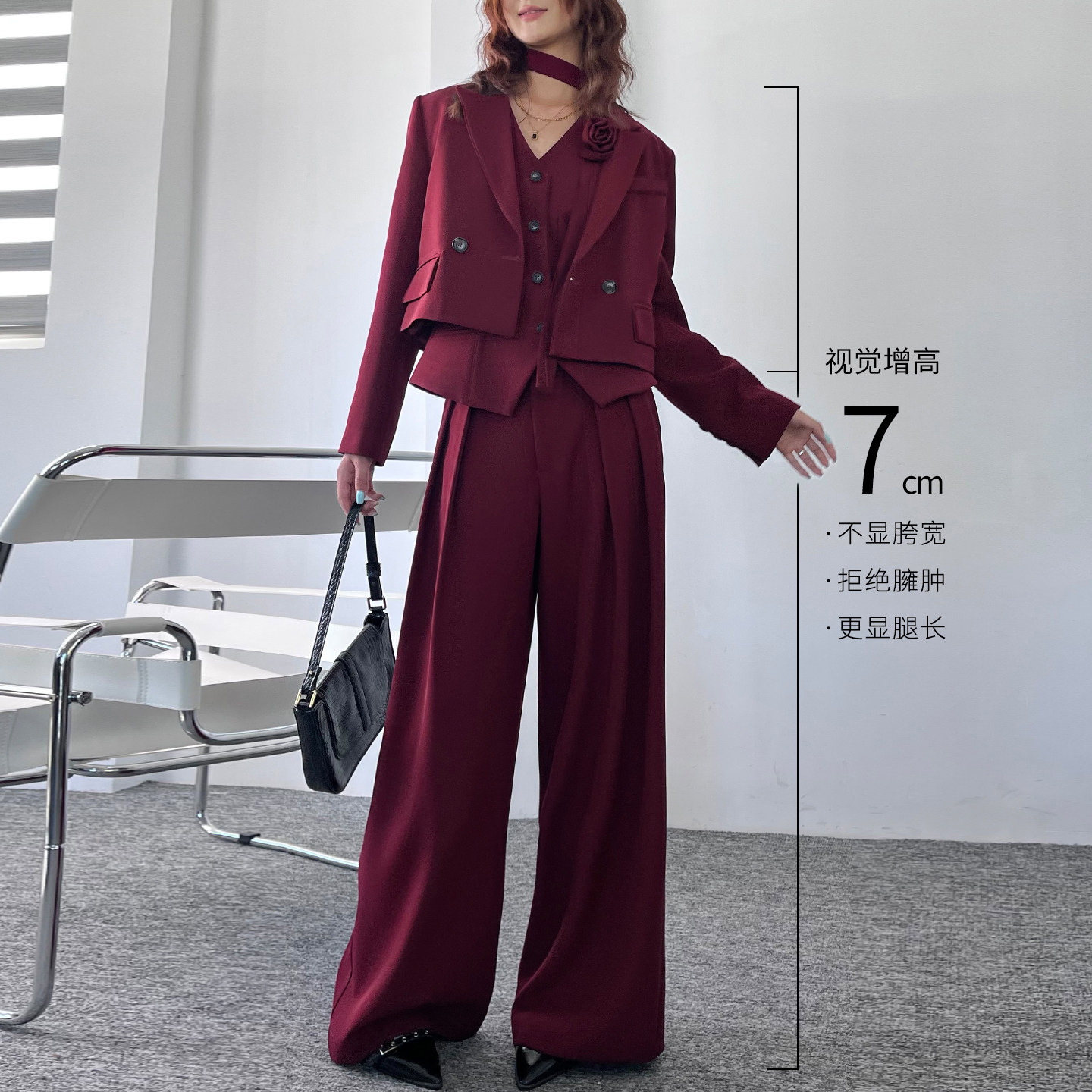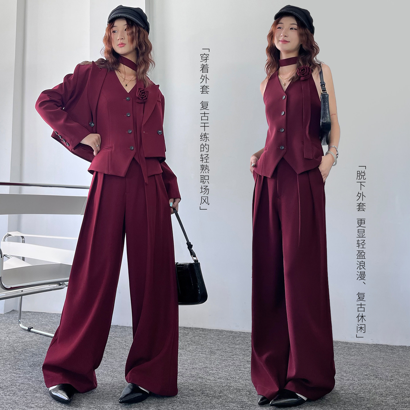 三件套休闲绑带面试装 职场轻奢西装 马夹阔腿裤 女春秋季 小西服 套装
