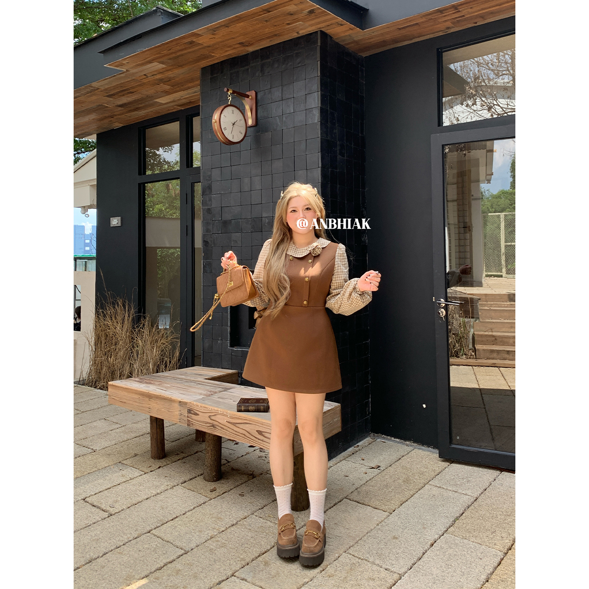 收腰裙子 法式 安妮不火 甜美娃娃领格纹麂皮拼接连衣裙女微胖大码