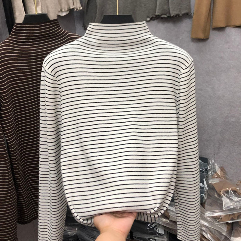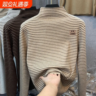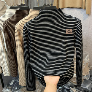 T恤加绒厚条纹上衣 大儿童半高领长袖 男女童德绒内搭打底衫 秋冬款