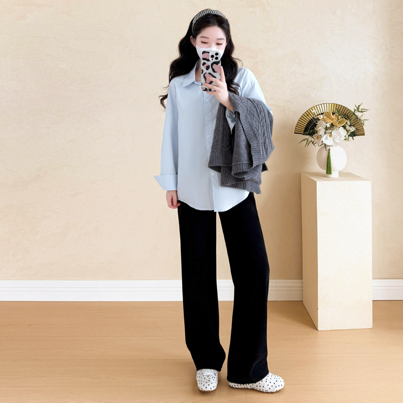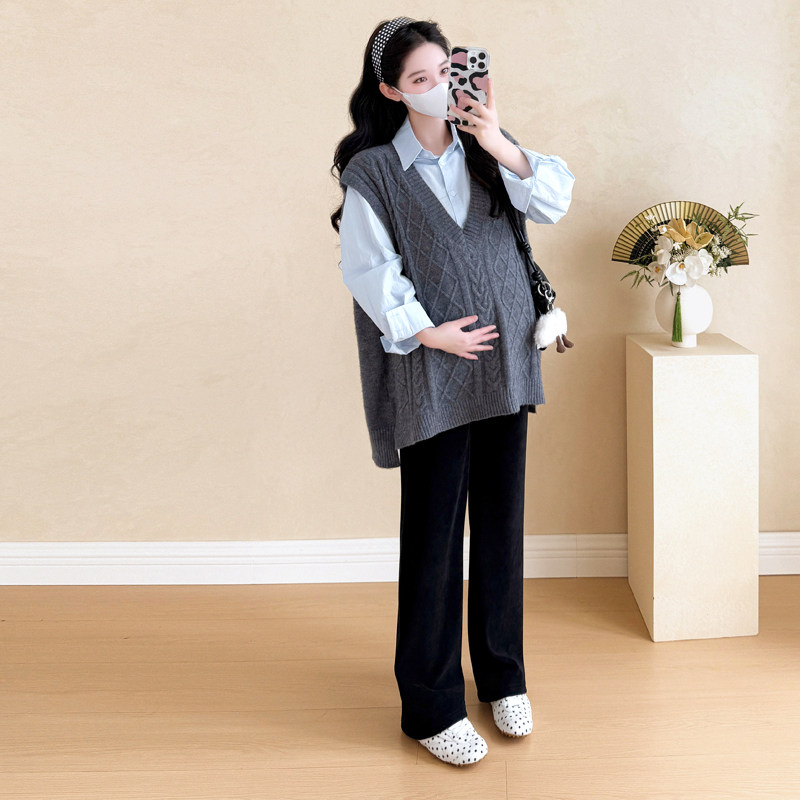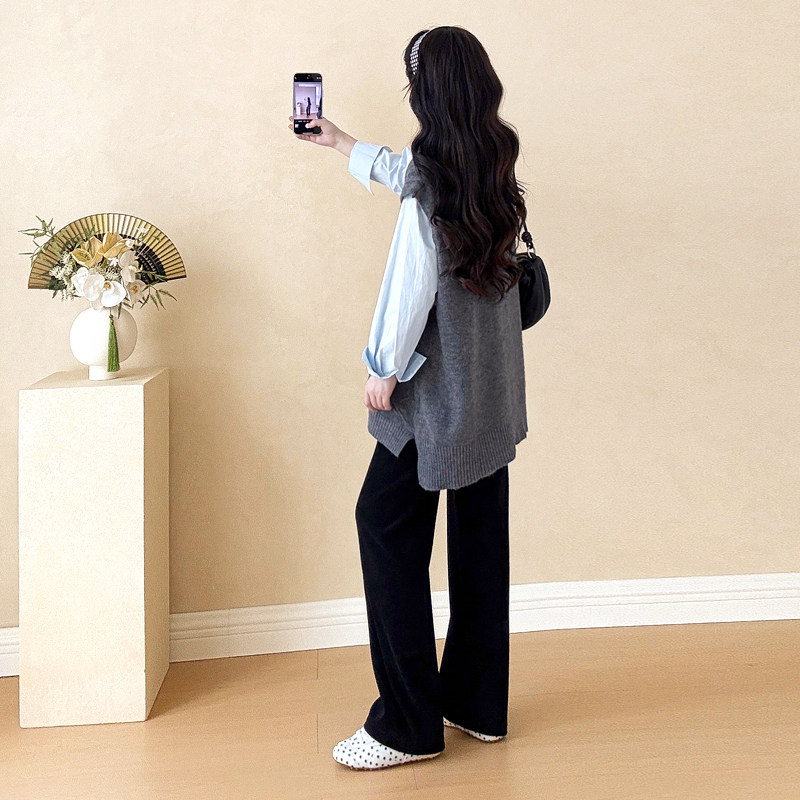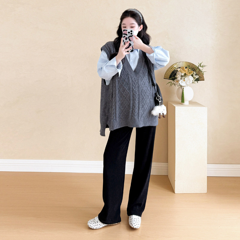 三件套装 韩式 灰色阔腿长裤 翻领毛衣开衫 温柔慵懒风立领马甲棉服