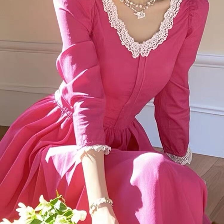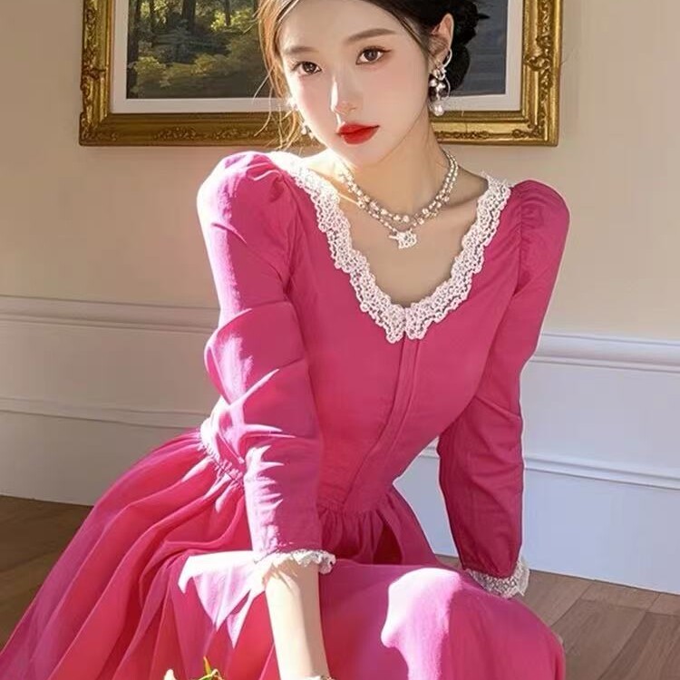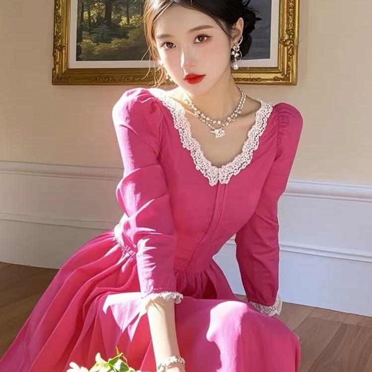 玫红色蕾丝边连衣裙春季 小个子韩系温柔甜美漂亮独特清纯掐腰裙子