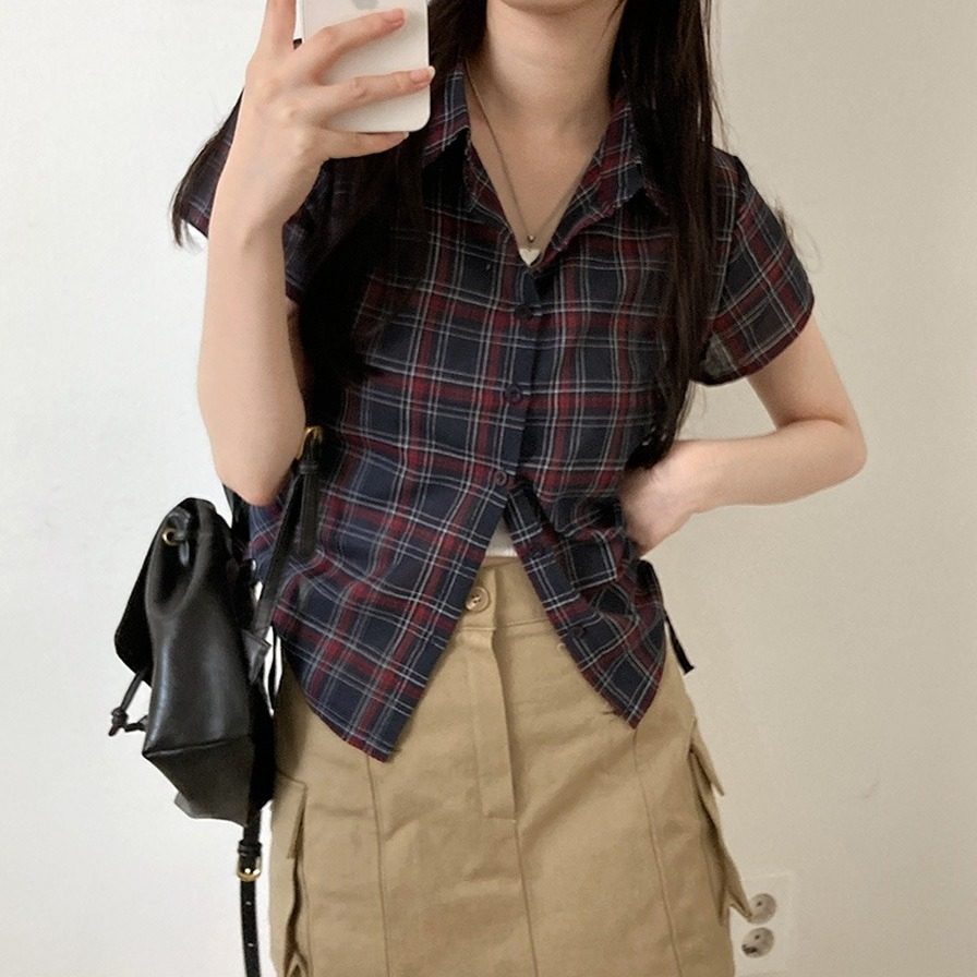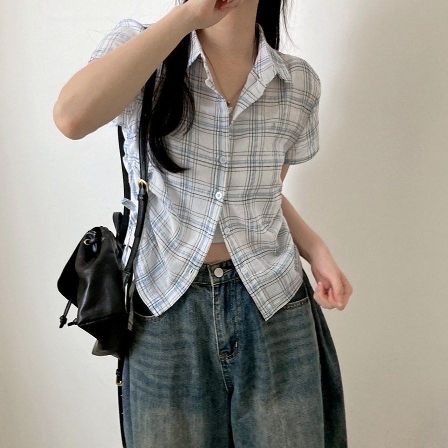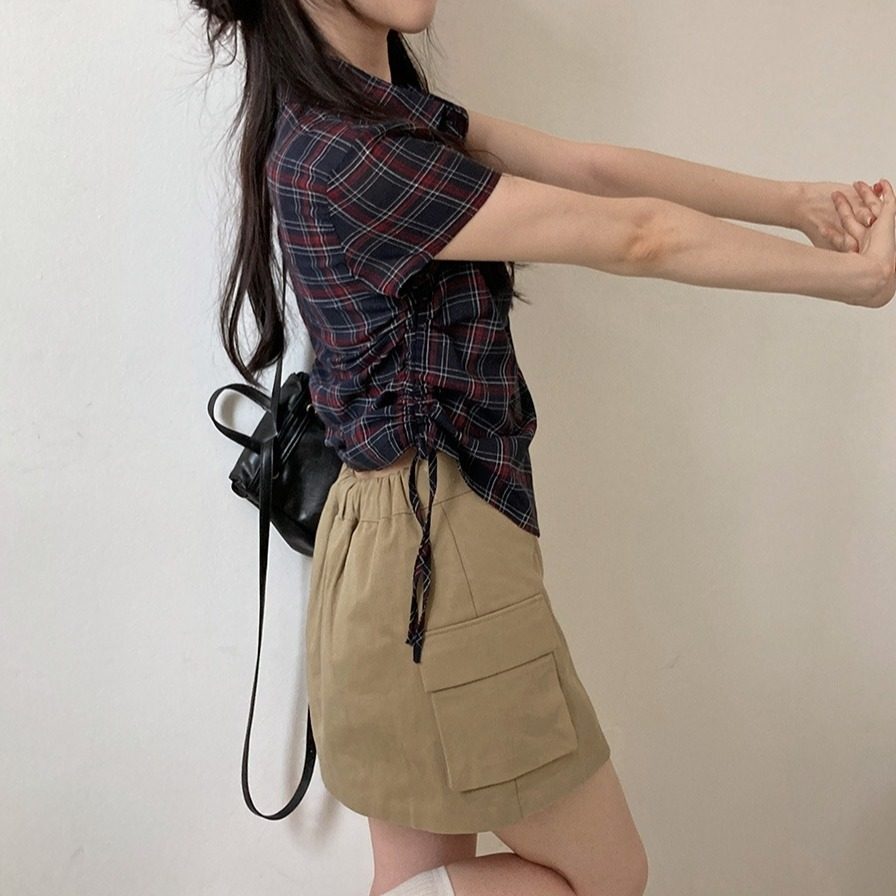 女短袖 韩国ins 抽绳格子衬衫 单排扣 衬衣 夏日