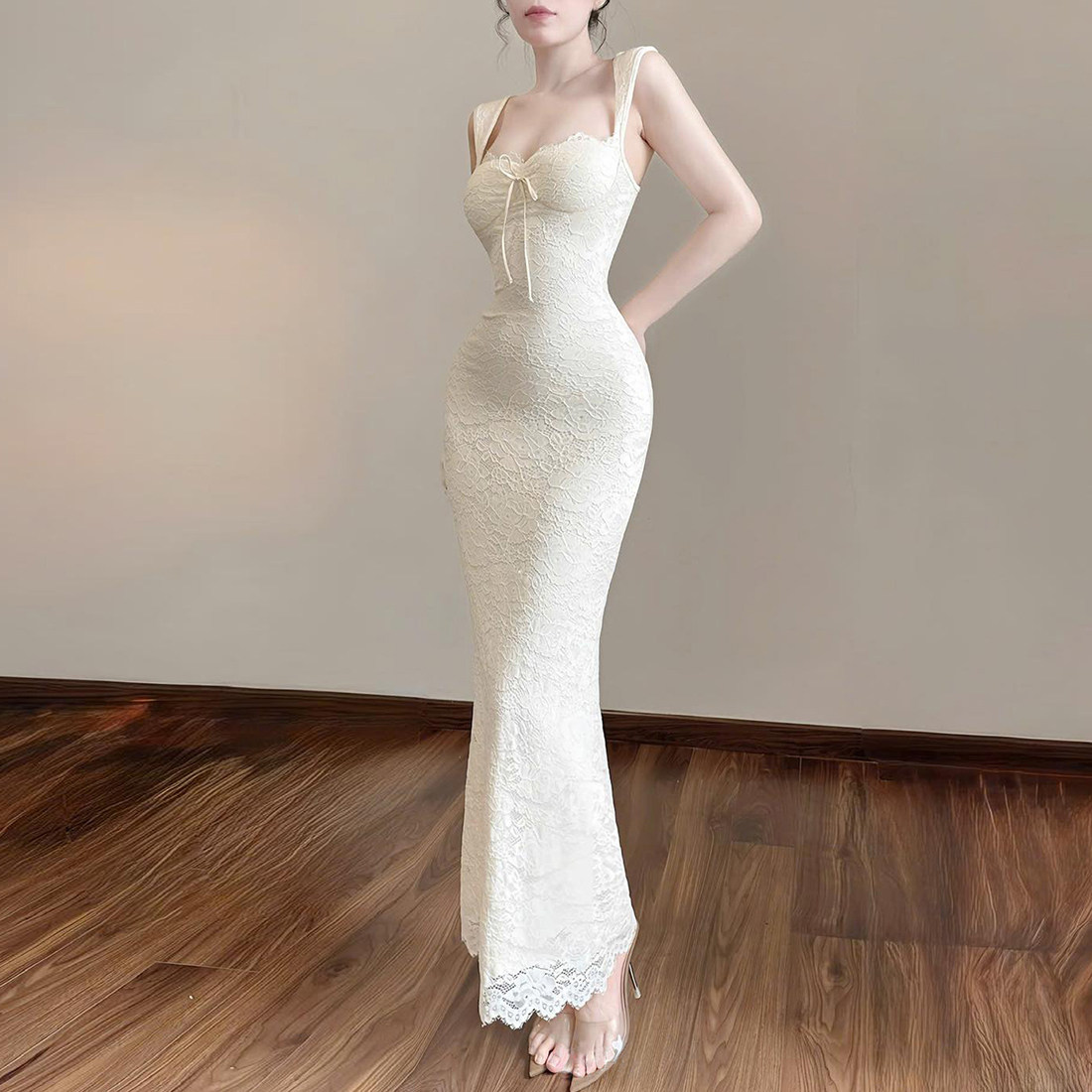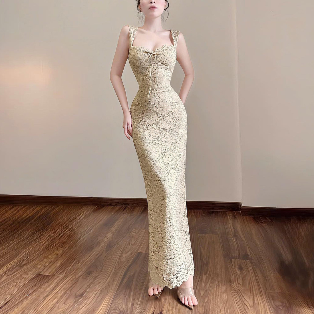怪诞女孩 显身材收腰包臀长裙 优雅性感肌理提花蕾丝吊带连衣裙女