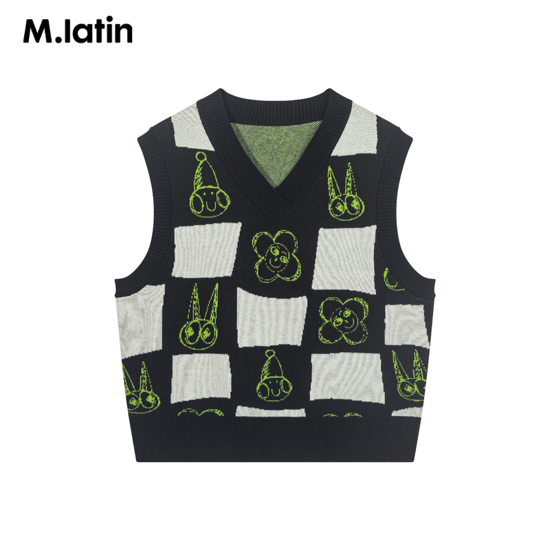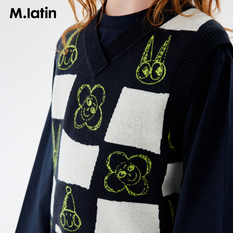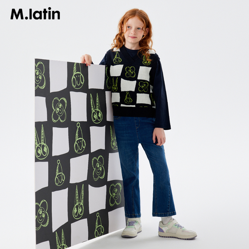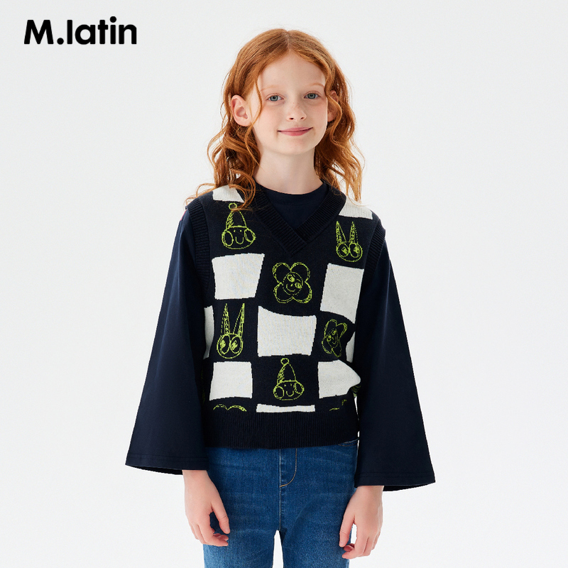 女童大童格纹图案宽松毛衣背心 新款 马拉丁童装 儿童毛衣2024秋装