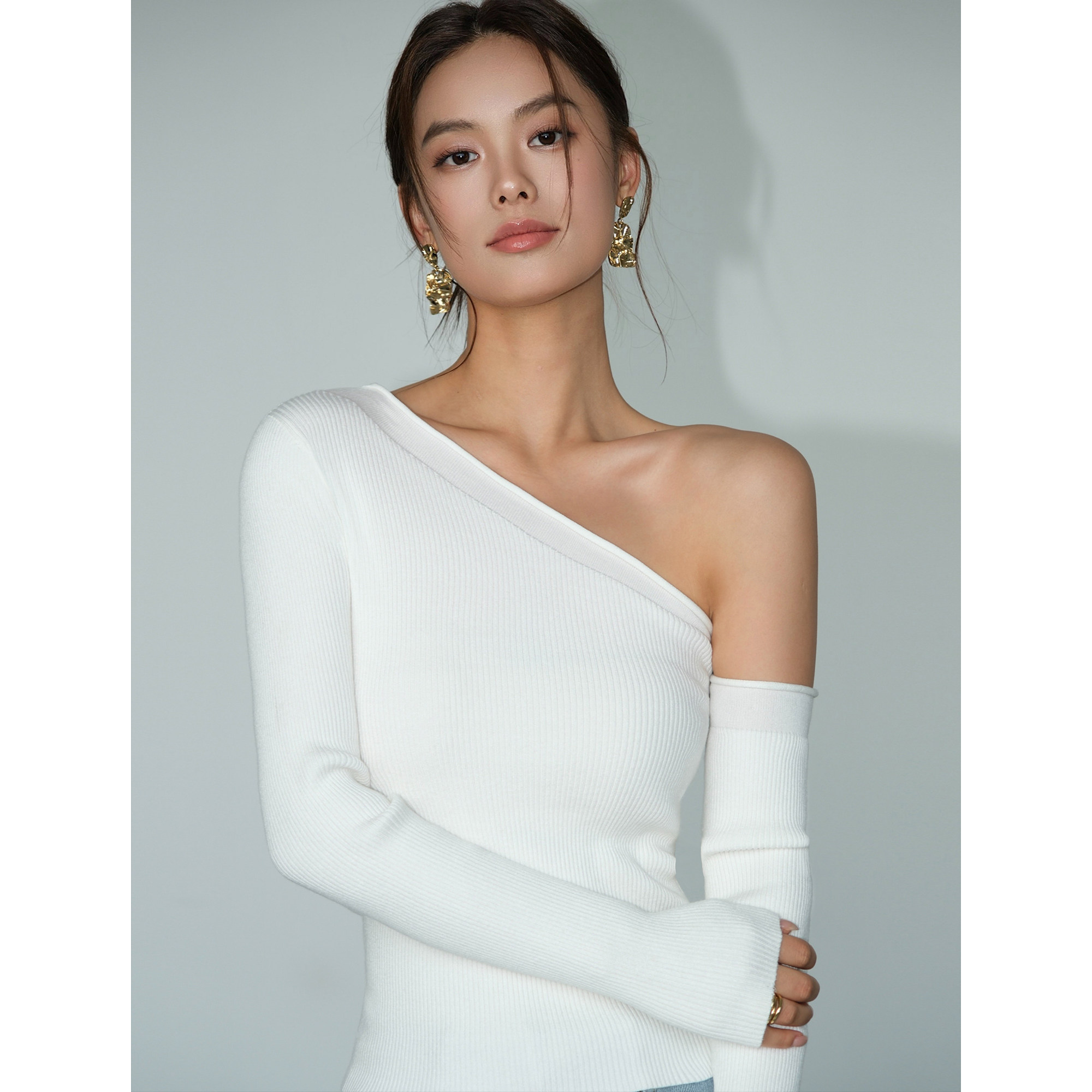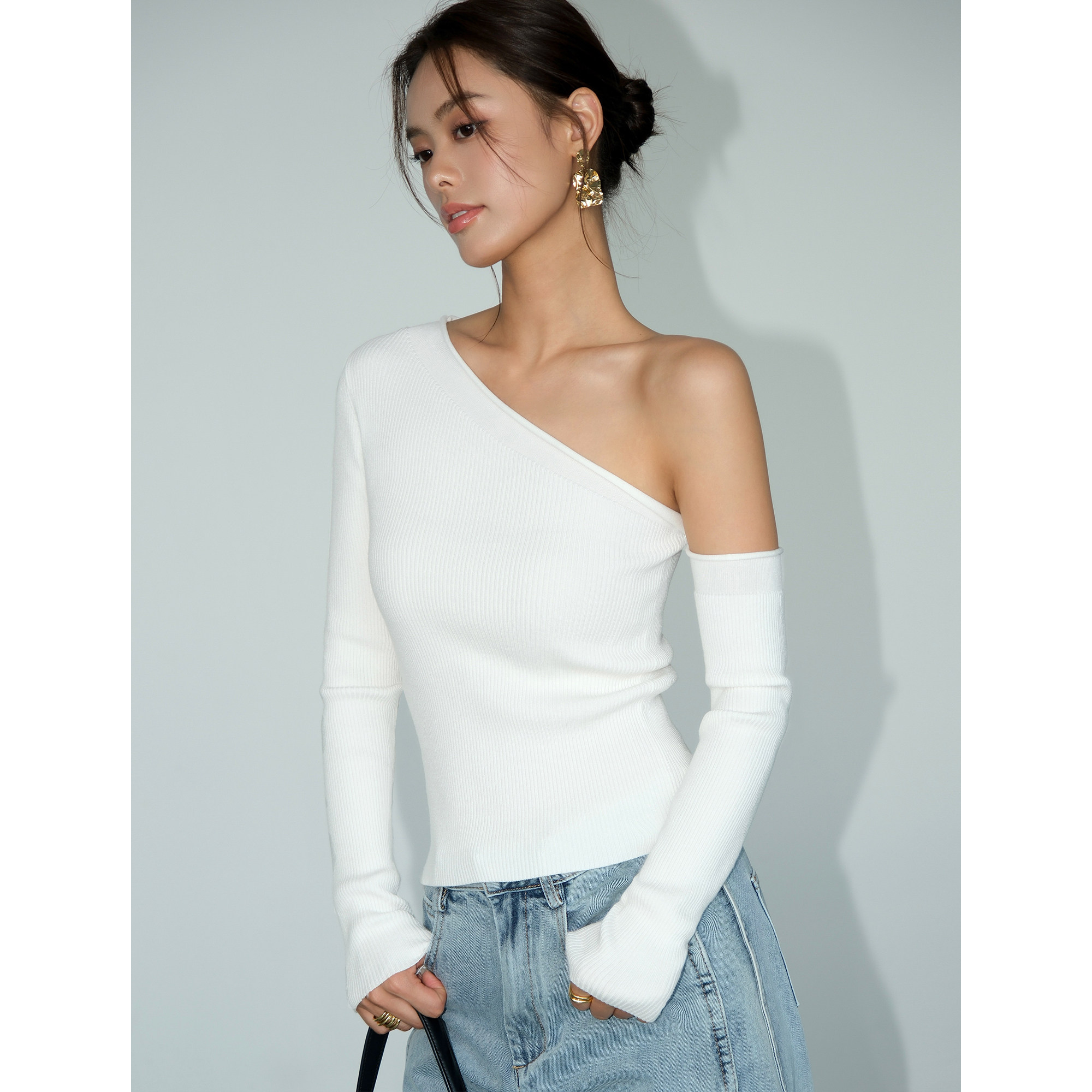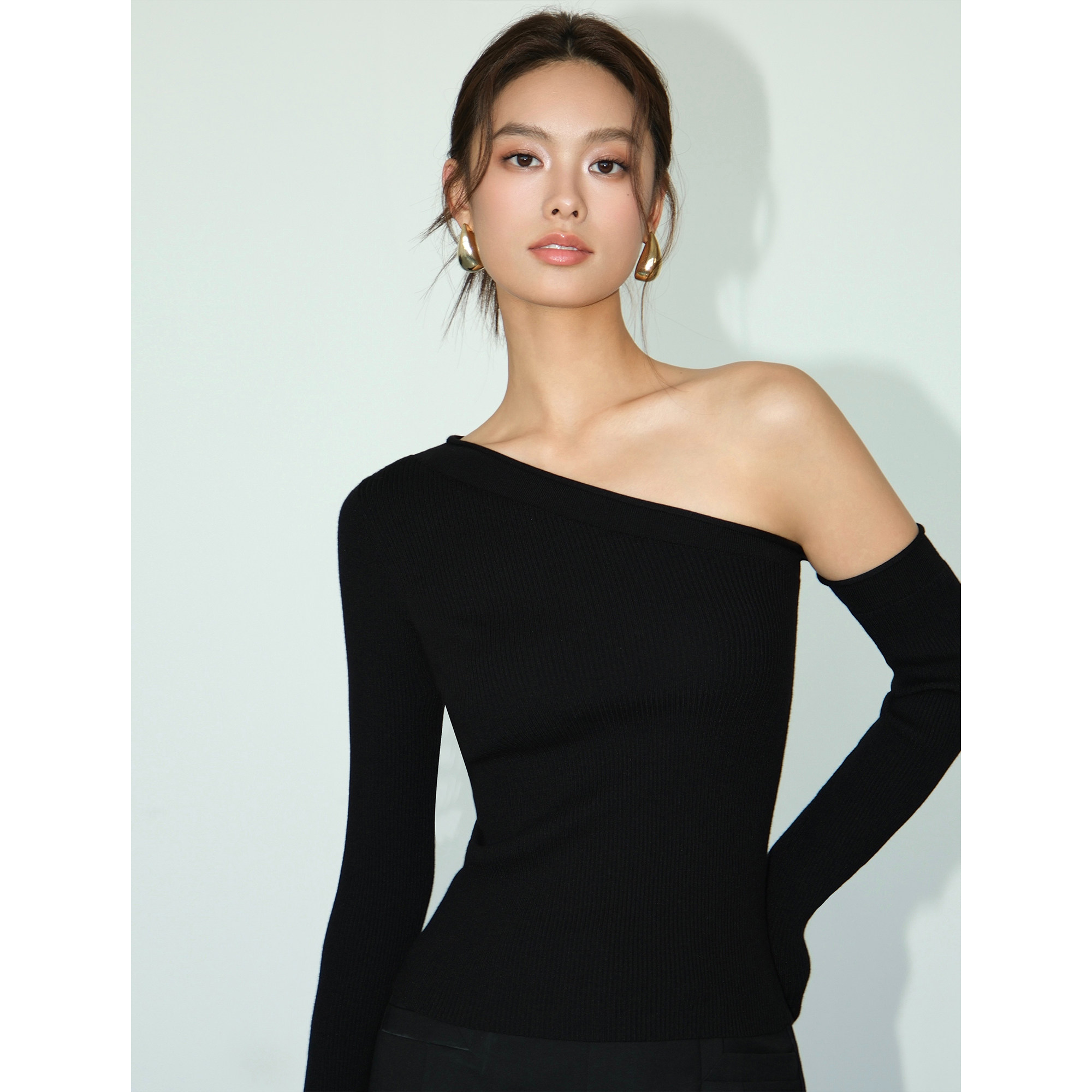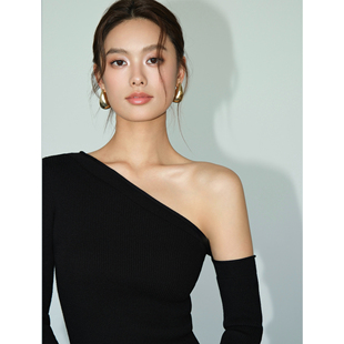 显瘦露肩短款 黑色单肩斜领修身 T恤女秋季 上衣 针织打底衫 NEVA