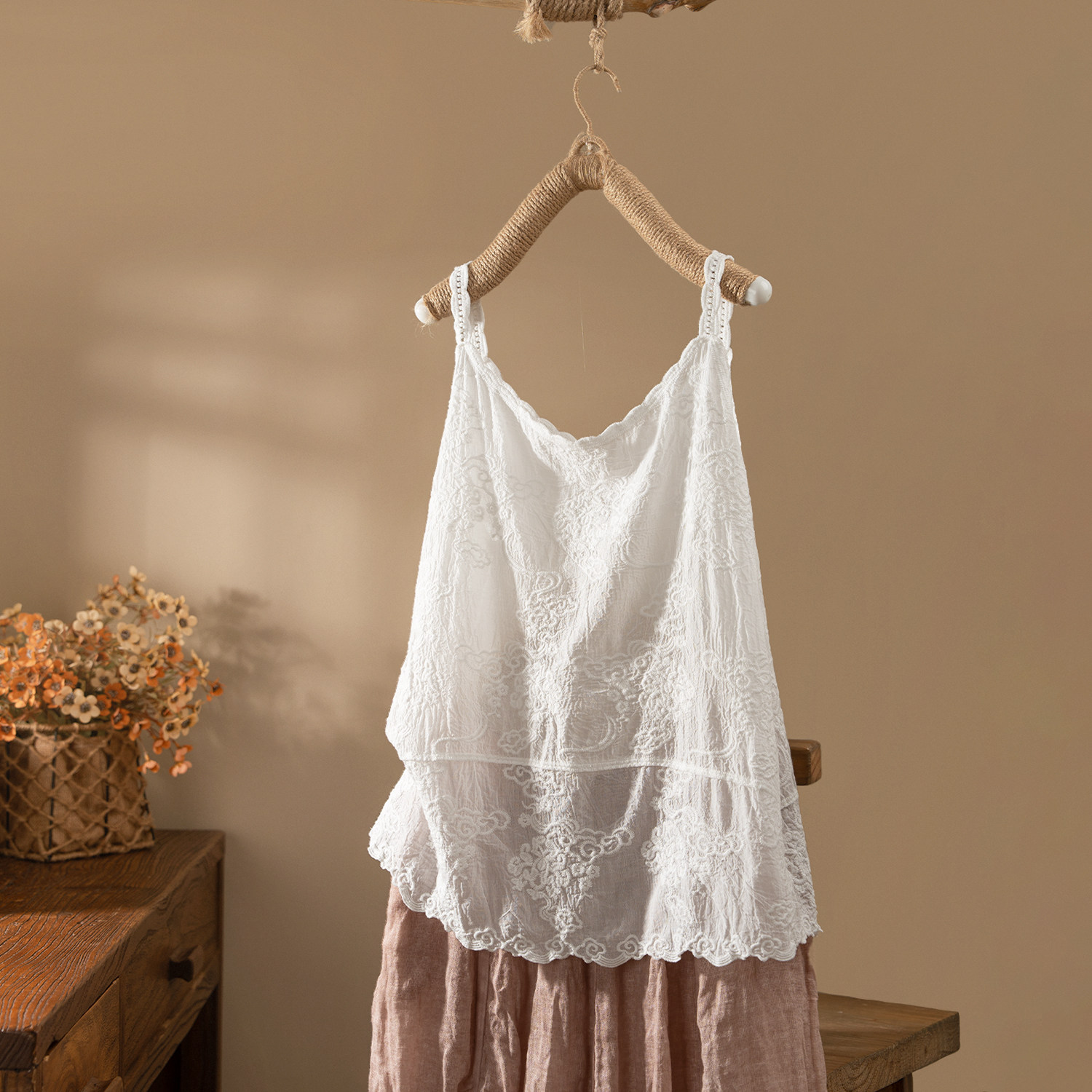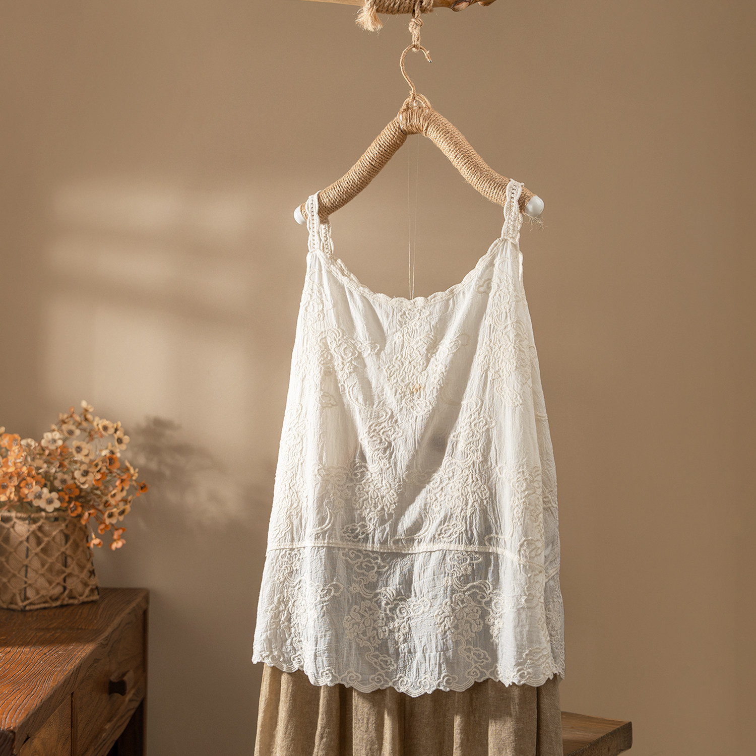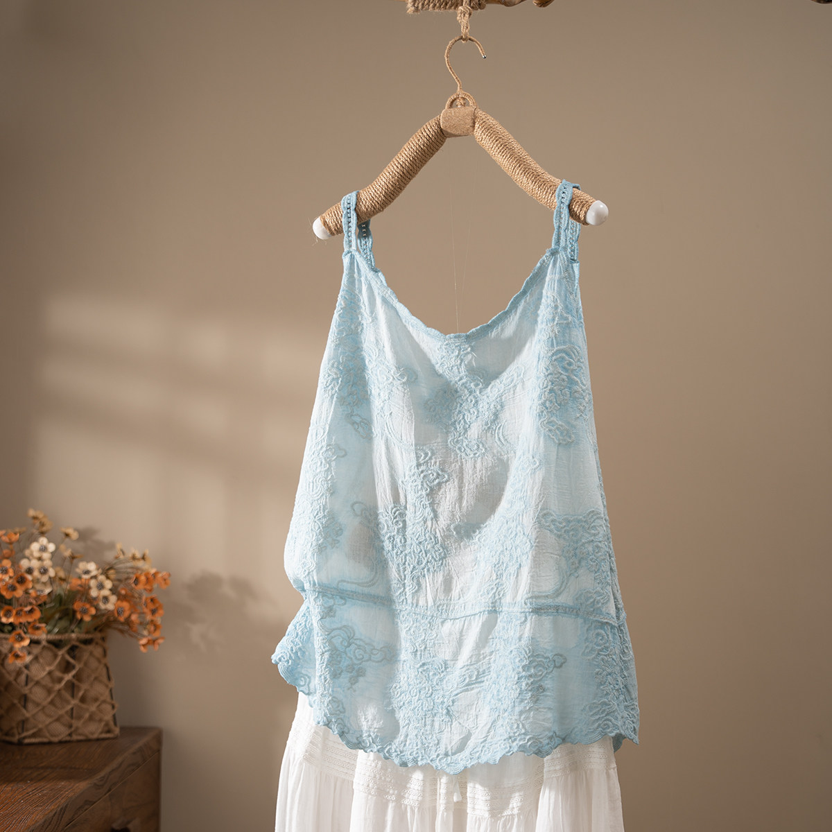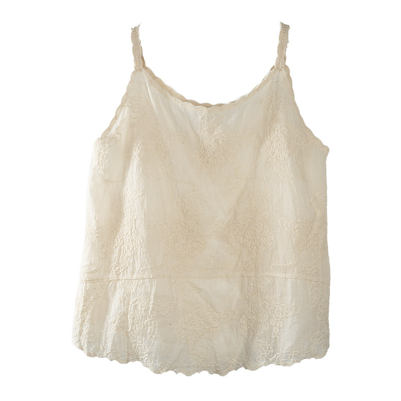 吊带背心女外穿宽松素雅上衣绣花内搭 森系纯棉中长款 2024夏季 新款