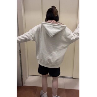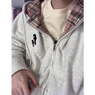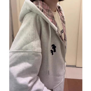 薄款 外套上衣 连帽撞色拼接格纹卫衣女春秋oversize宽松慵懒风开衫