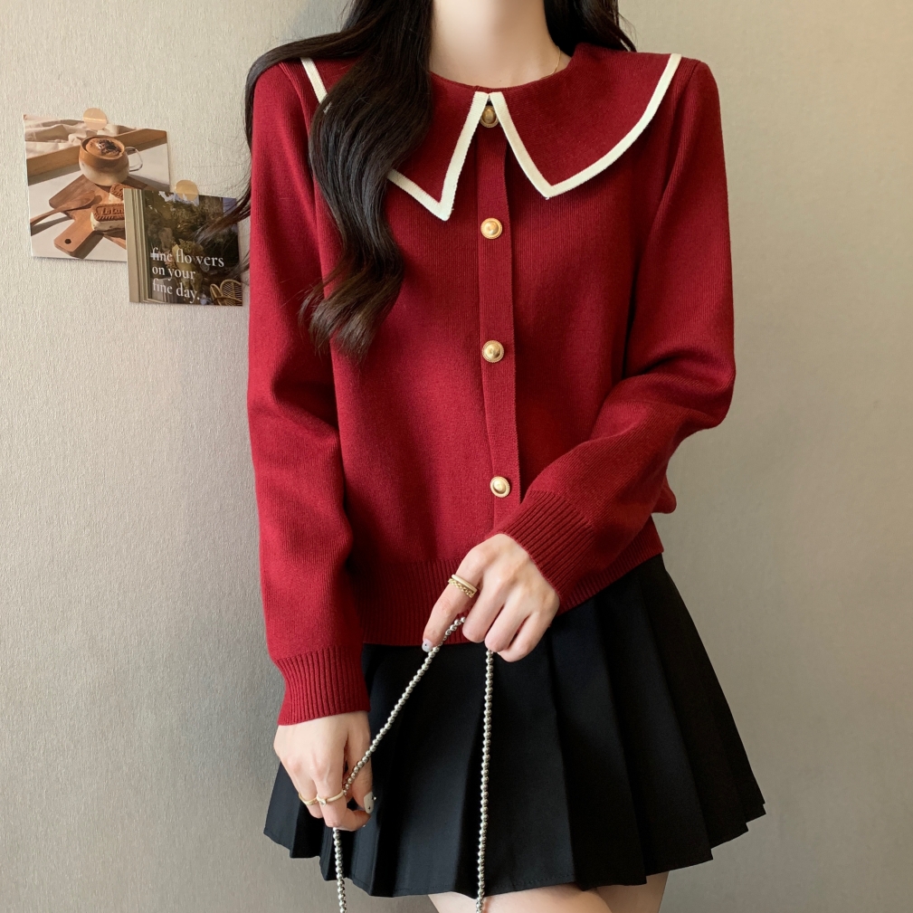 娃娃领上衣小香风针织打底衫 显瘦红色毛衣女秋冬2024新款 女装 大码