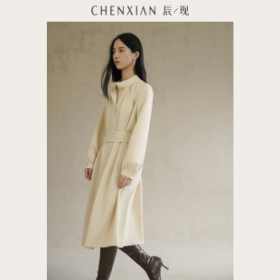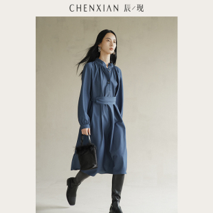 收腰连衣裙清冷感A字长裙女 复古牛仔蓝立领宽松长袖 到手199元