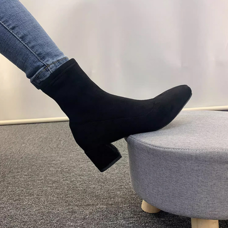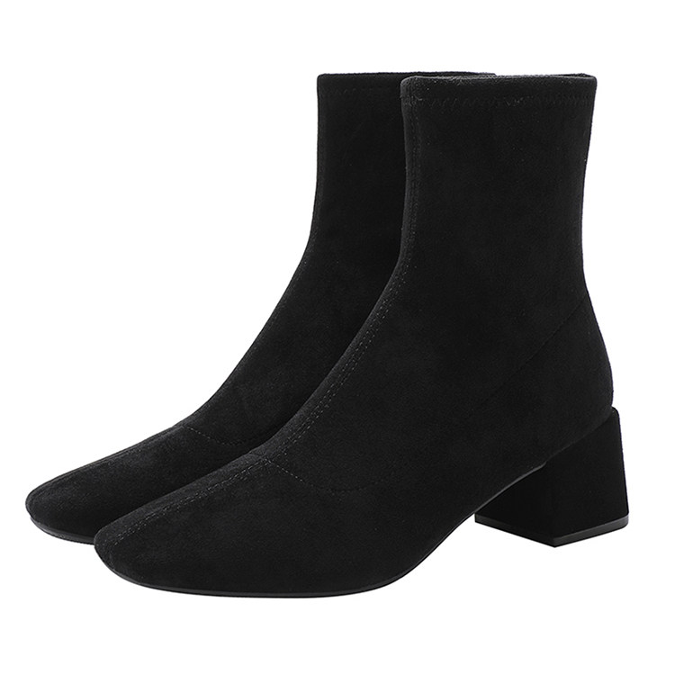 方头粗跟短靴女2025新款 春秋单靴网红百搭绒面袜靴套筒弹力瘦瘦靴