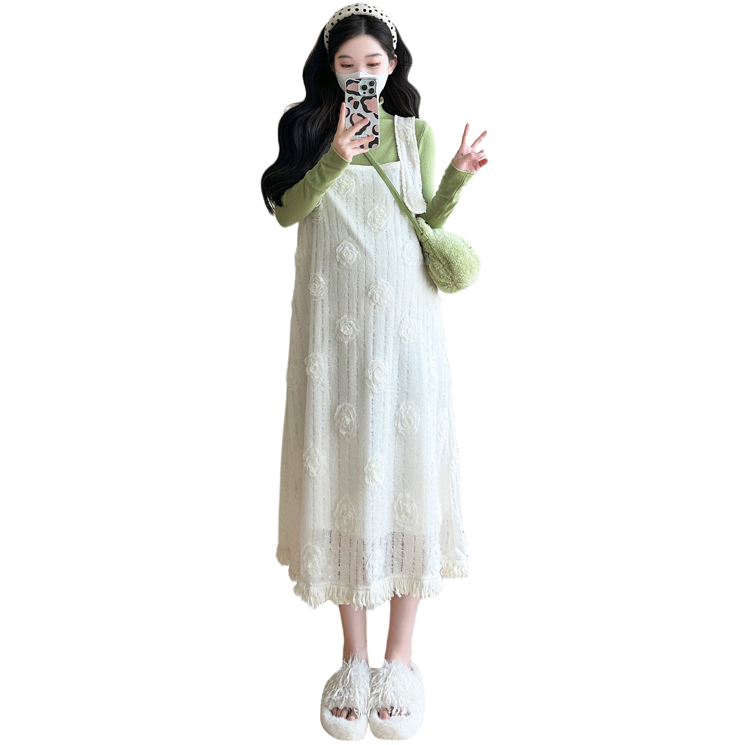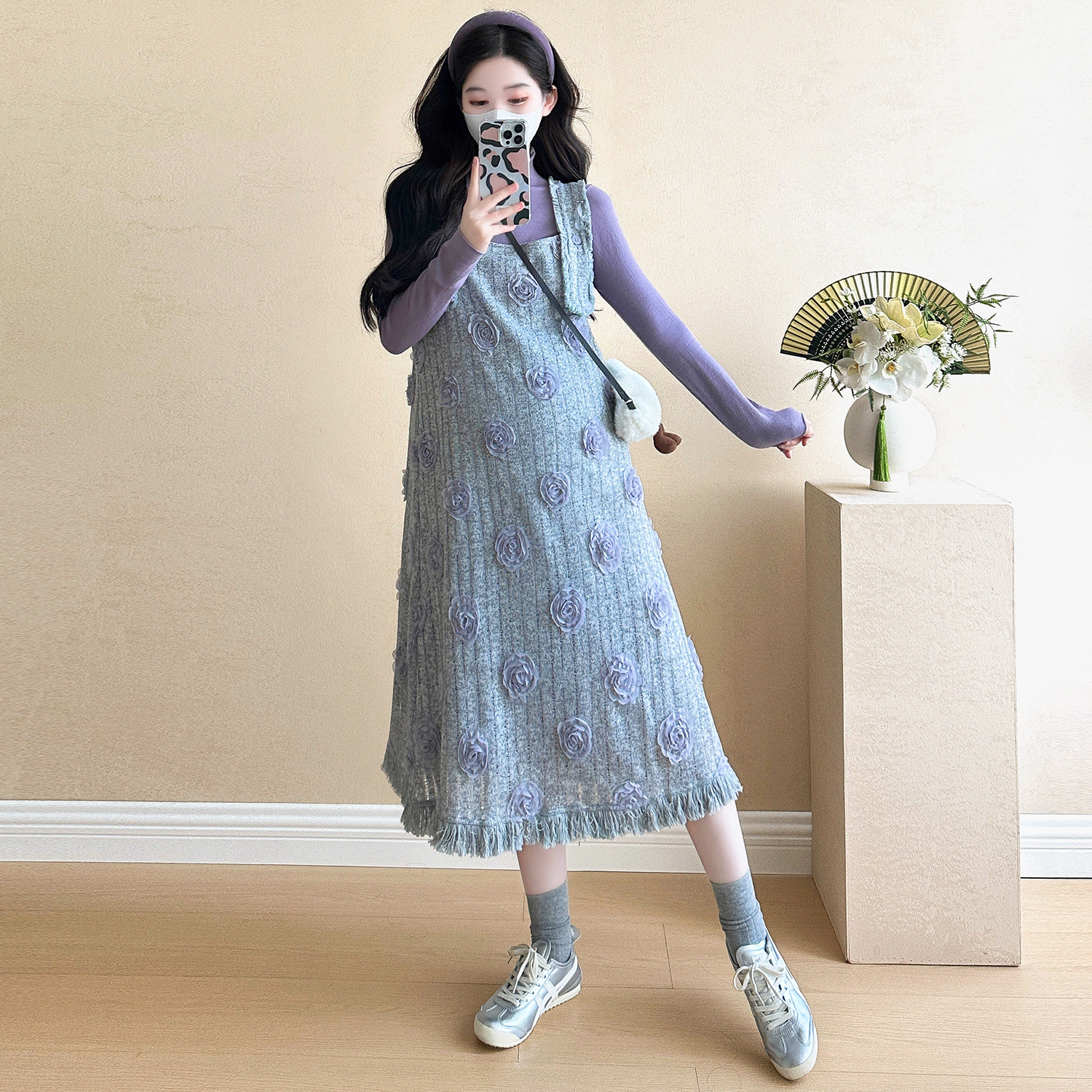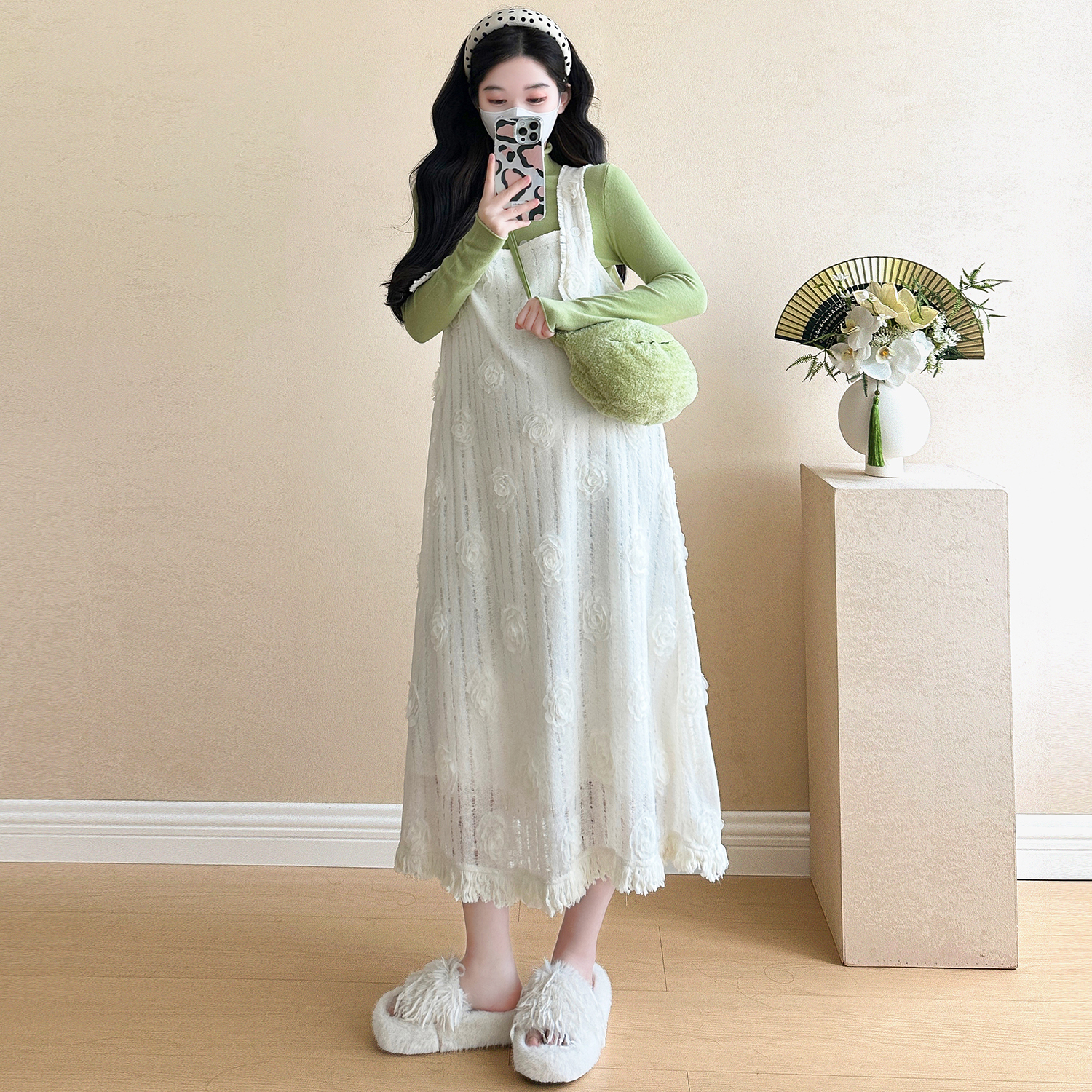 显瘦花朵背带裙2025韩版 孕妇早春两件套新款 中长款 纯色打底衫 时尚