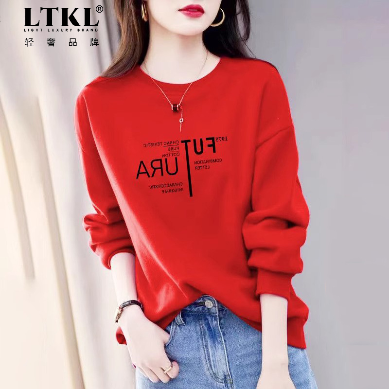 套头上衣 圆领长袖 军绿色字母印花卫衣女春秋新款 洋气休闲宽松大码