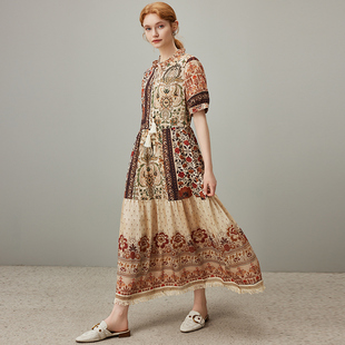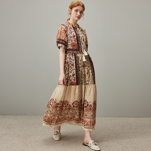 度假风长裙 高腰薄款 dfvc亚麻波西米亚印花连衣裙女2025年夏季 新款