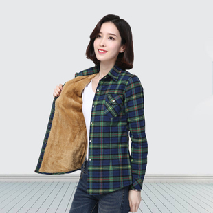 衬衫 大码 女装 韩版 格子打底衬衣 秋冬新款 加绒加厚纯棉保暖修身 女式