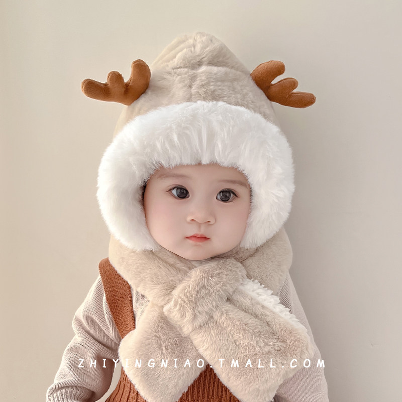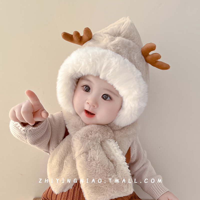 儿童帽子冬季 男孩卡皮巴拉耳朵会动毛绒帽男女宝宝防风围脖一体帽