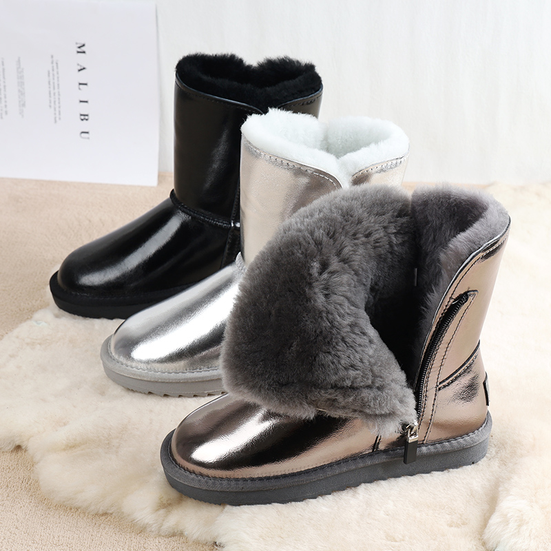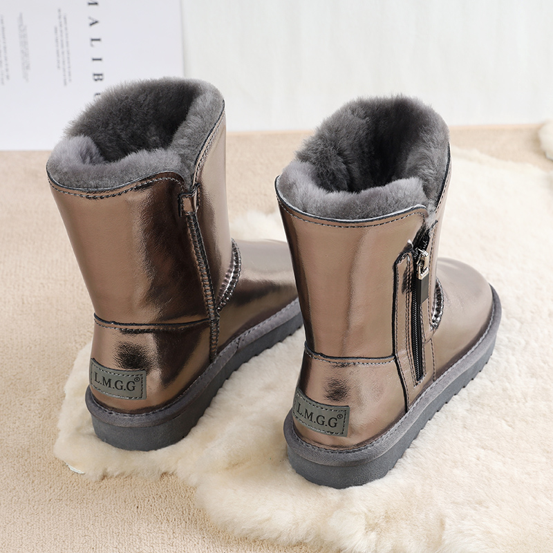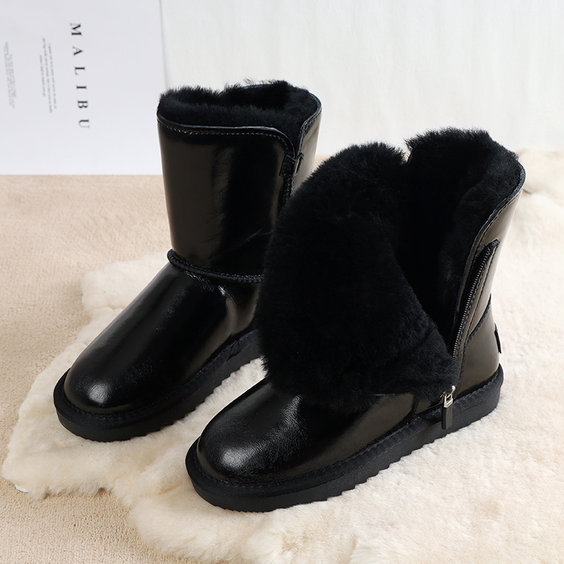 中筒拉链雪地靴女加绒加厚东北冬季 防水防滑皮面保暖皮毛一体棉鞋