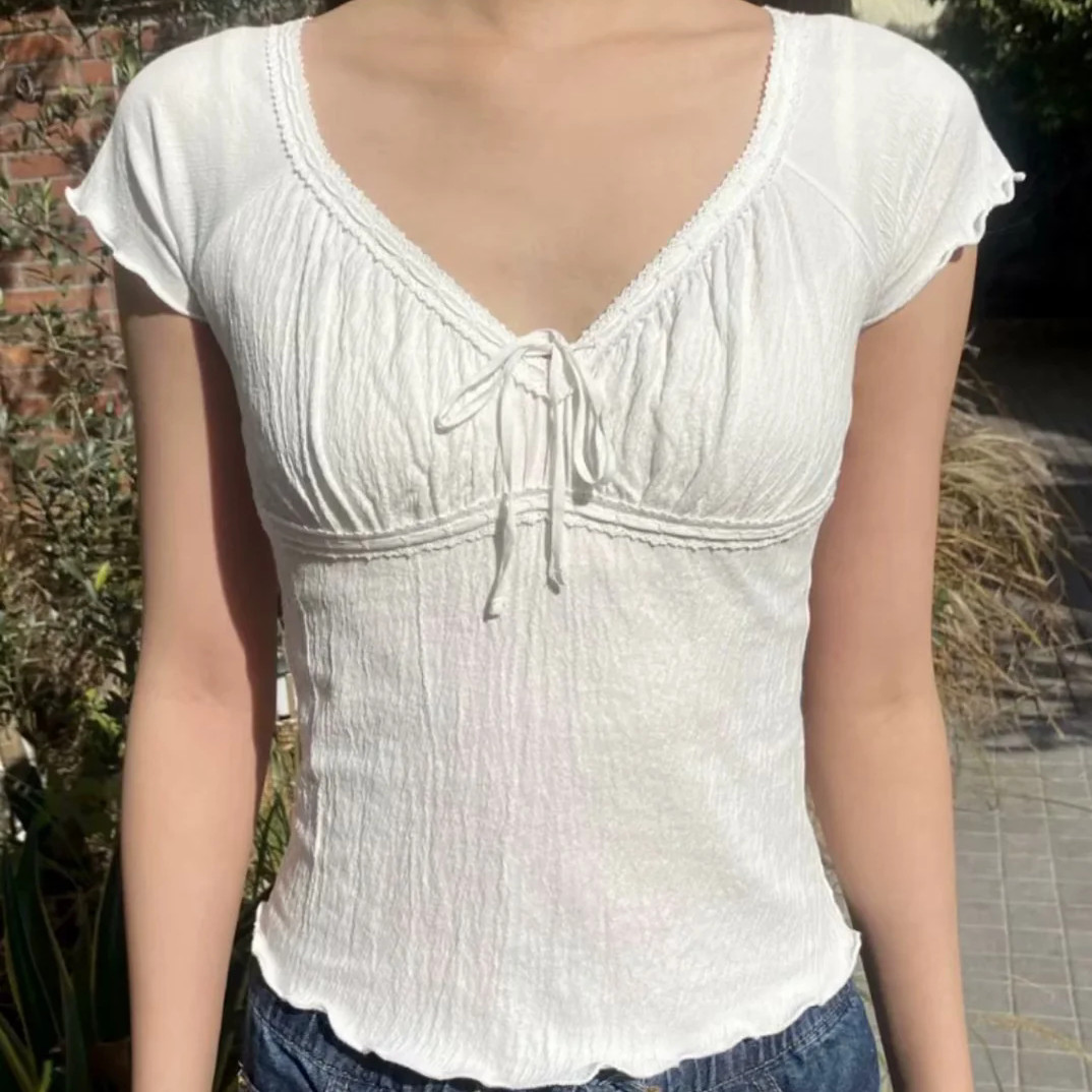 T恤bm纯欲百搭上衣 复古V领蝴蝶结系带木耳边短袖 Brandy Girl美式