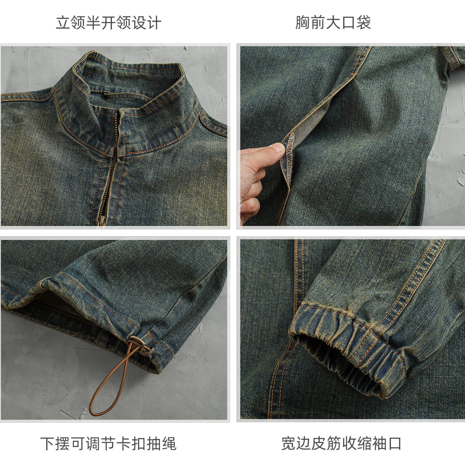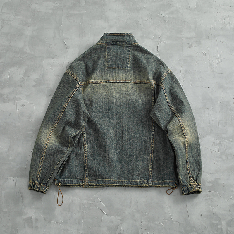 高街美式 复古做旧水洗套头夹克宽松INS立领外套 牛仔上衣男春秋季