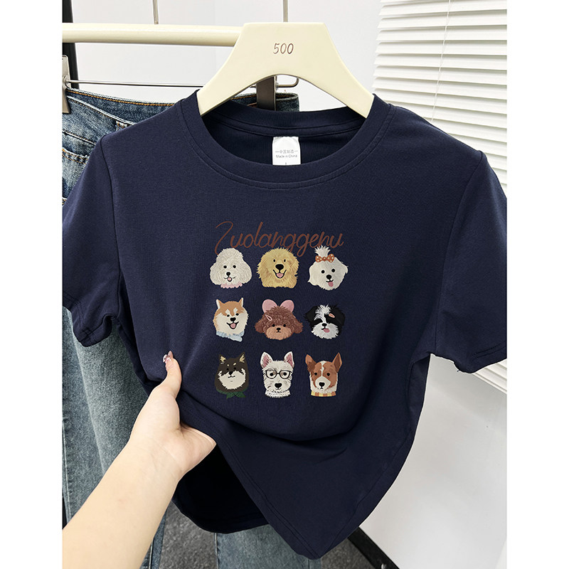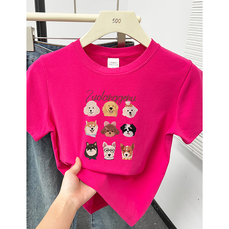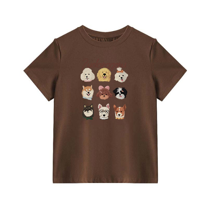 小个子洋气显瘦百搭棕色圆领上衣 小狗印花夏季 正肩短袖 T恤女美式