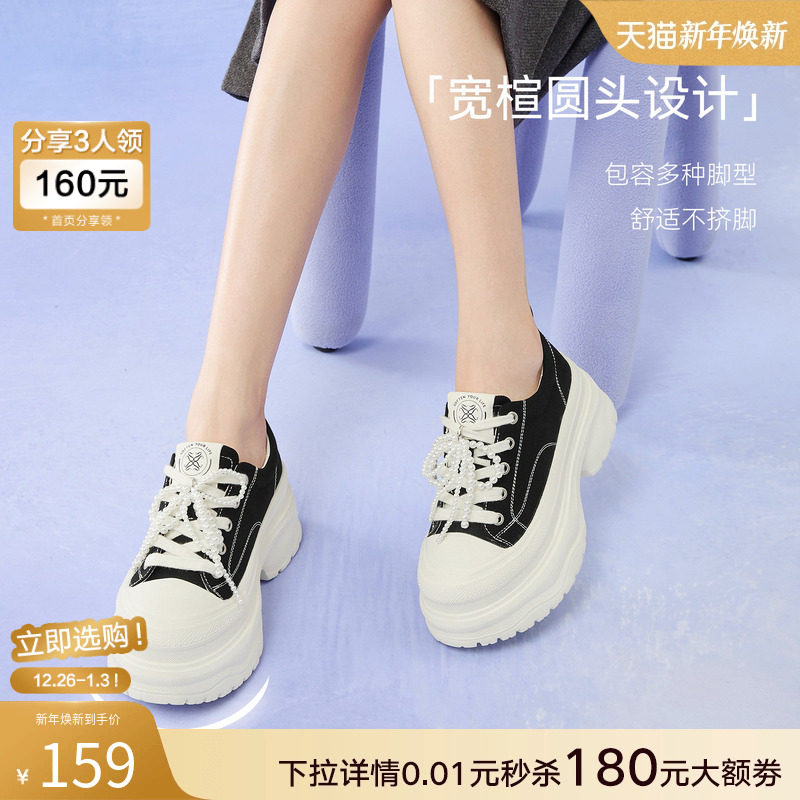 百搭厚底增高女休闲鞋 珍珠拼色帆布鞋 D3175CM5 新款 百思图2025秋季