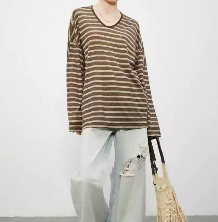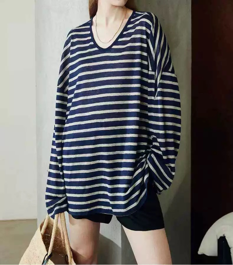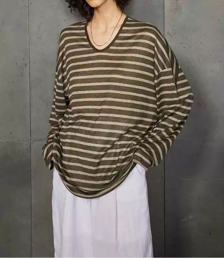 日本进口苣轻薄亚麻色织条纹落肩分割宽松懒人长袖 开间 时髦B入