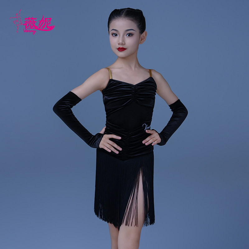 薇妮拉丁舞服女童褶皱连衣裙2024新款 高级感带手套少儿练功服夏季