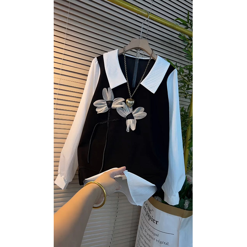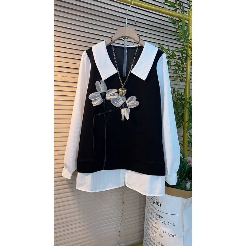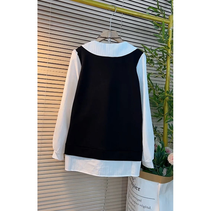衬衫 显瘦遮肉遮肚中长款 方领减龄 上衣韩版 春秋胖mm宽松假两件长袖