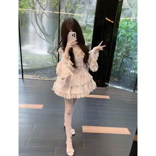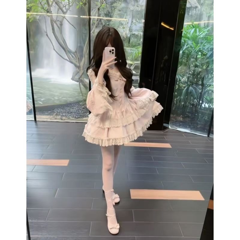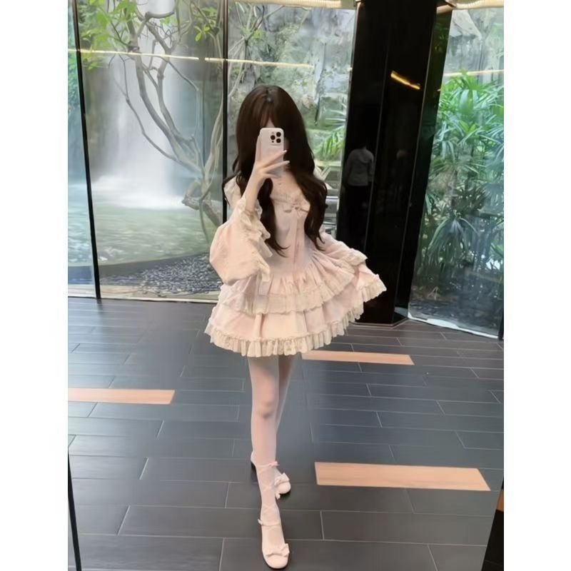 甜美超仙温柔风洛丽塔粉色少女感重工蝴蝶结荷叶边拼接蛋糕蓬蓬裙