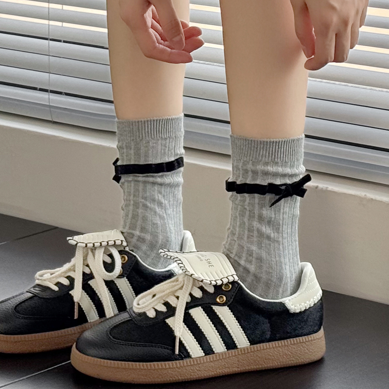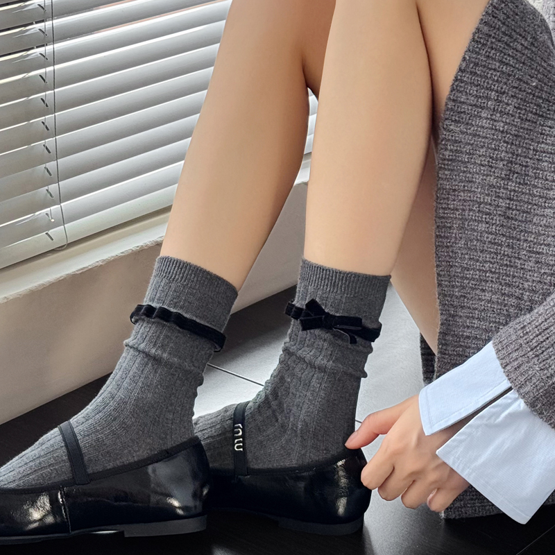 秋冬烟灰色小腿袜女小香风蝴蝶结jk白色中筒袜黑色堆堆袜棉短袜子