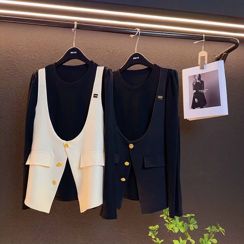 胖妹妹名媛风显瘦长袖 秋季 女装 2024大码 撞色假两件马甲上衣潮 新款