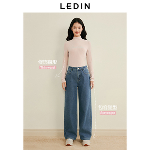 高腰宽松显瘦弯刀裤 拉夏贝尔深蓝色加绒阔腿牛仔裤 女秋冬2025新款