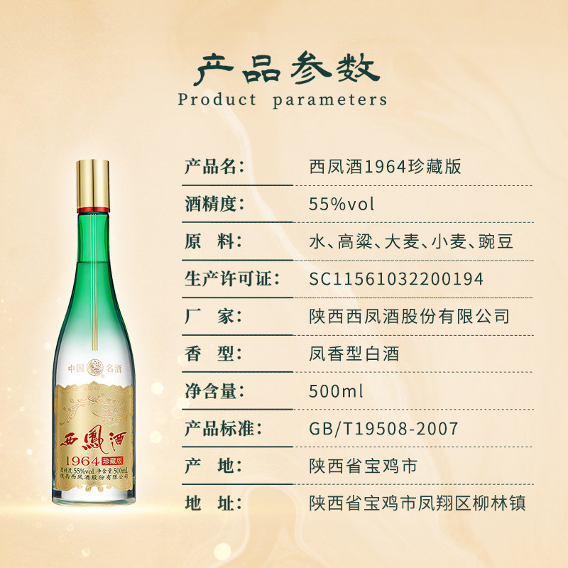 500ml 凤香型白酒整箱装 西凤酒55度1964珍藏版 6瓶 官方正品