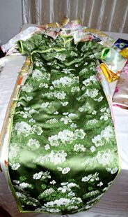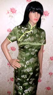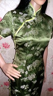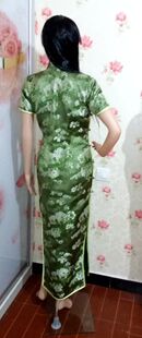 绿底牡丹35织锦短袖 全新样衣出售 斜襟复古优雅精致高开叉旗袍L码