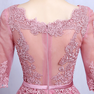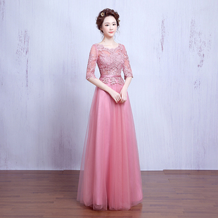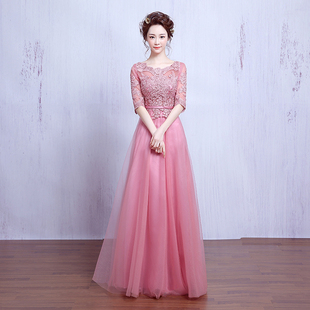 中袖 长款 一字肩年会主持宴会晚礼服粉色合唱服演出服 2024韩式 新款