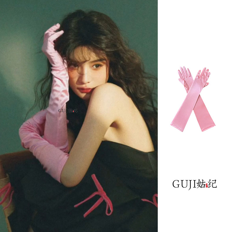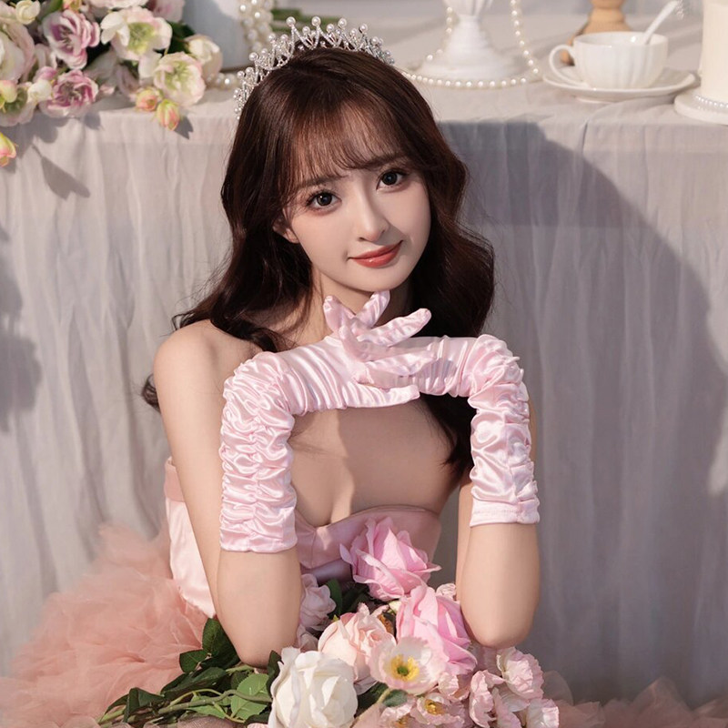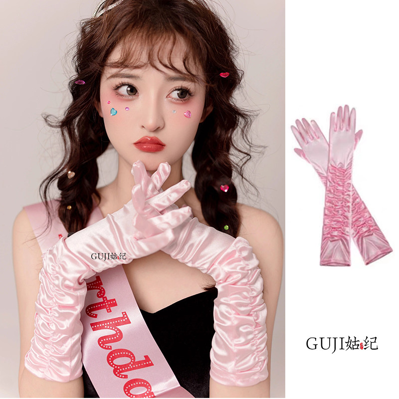 饰绸缎手袖 套手臂装 高级感 复古缎面长手套粉色公主生日礼服袖 法式