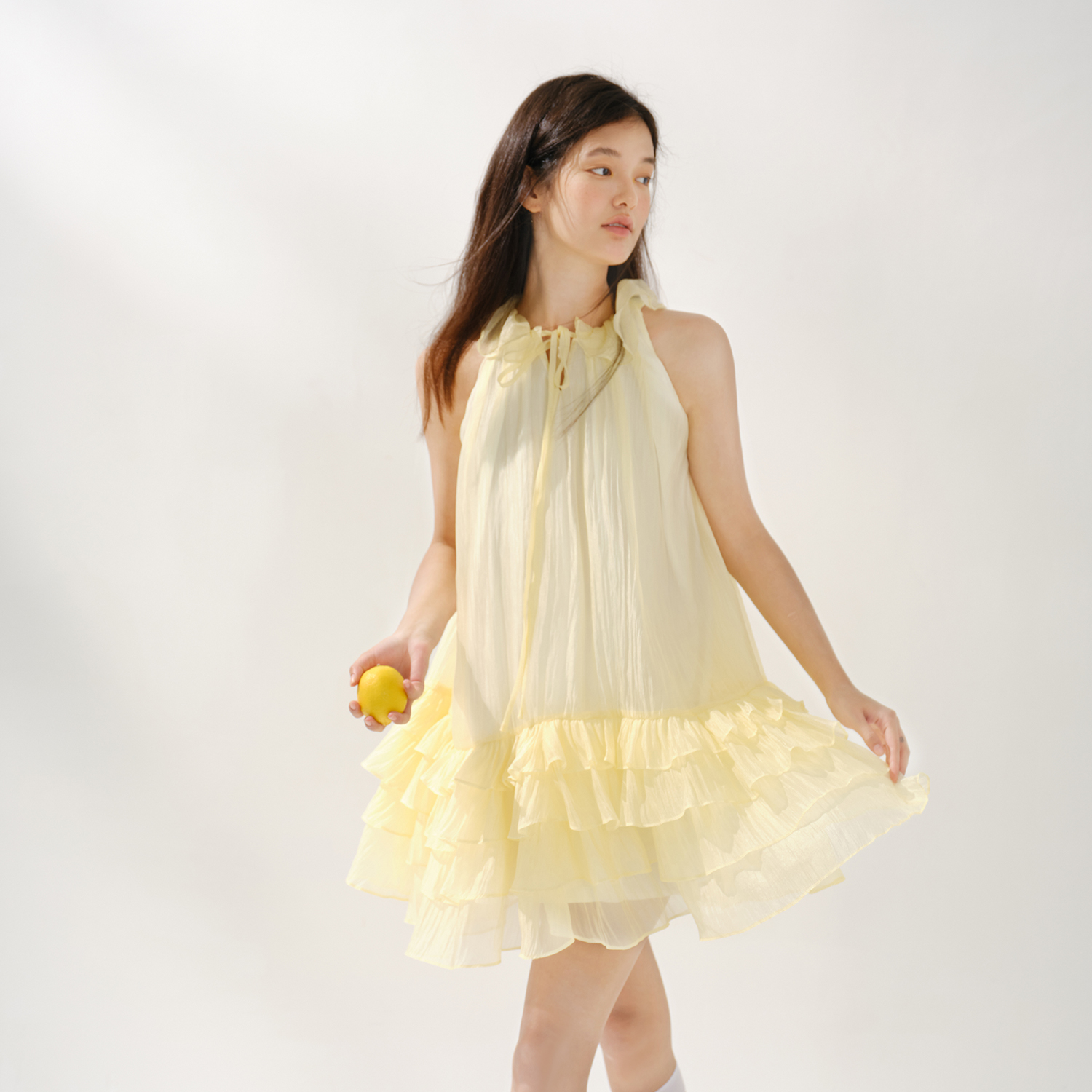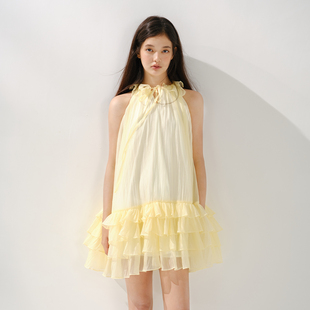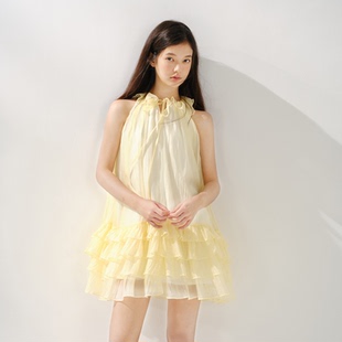连衣裙女宽松多层木耳边蛋糕裙 明黄色系带无袖 RECIT 柠檬香气