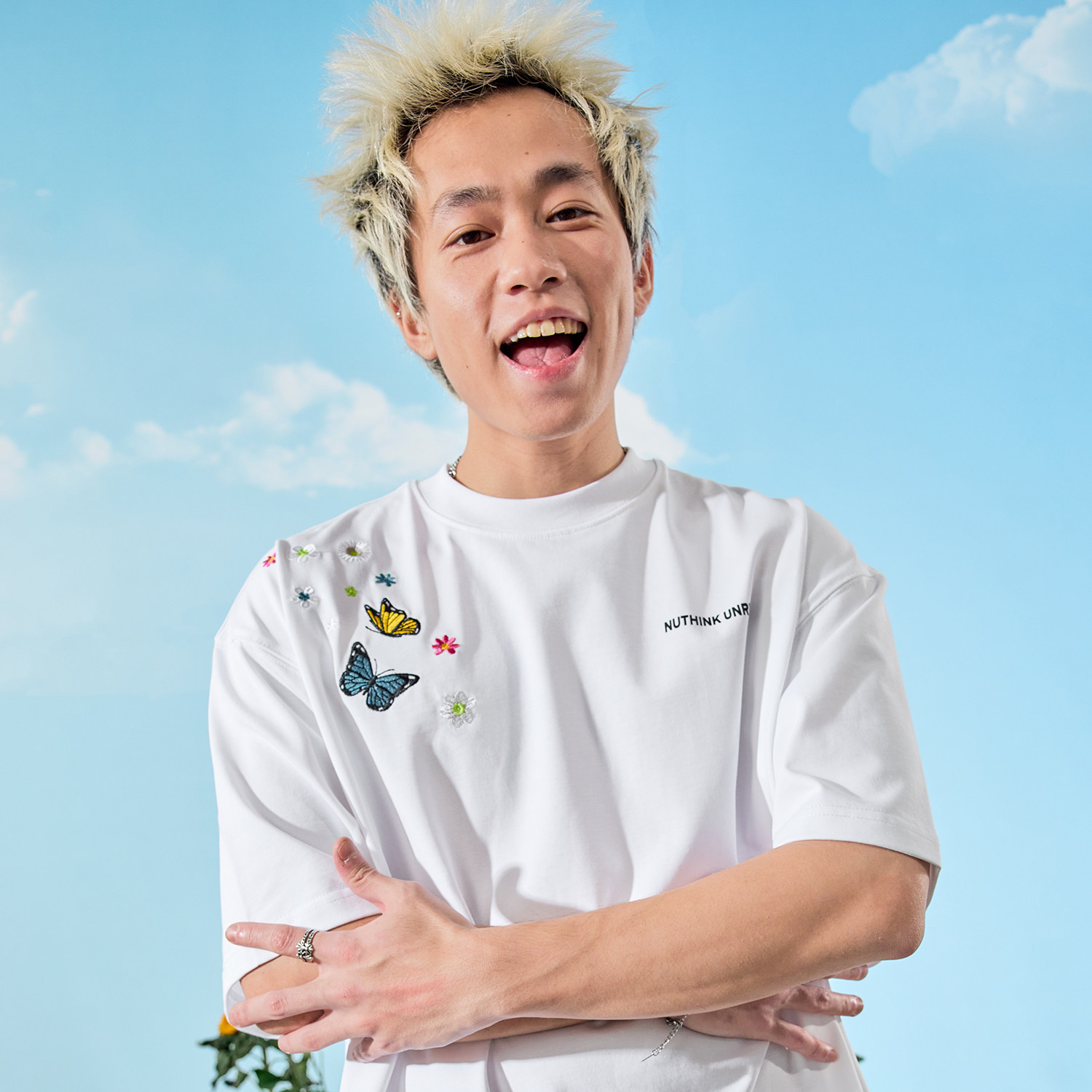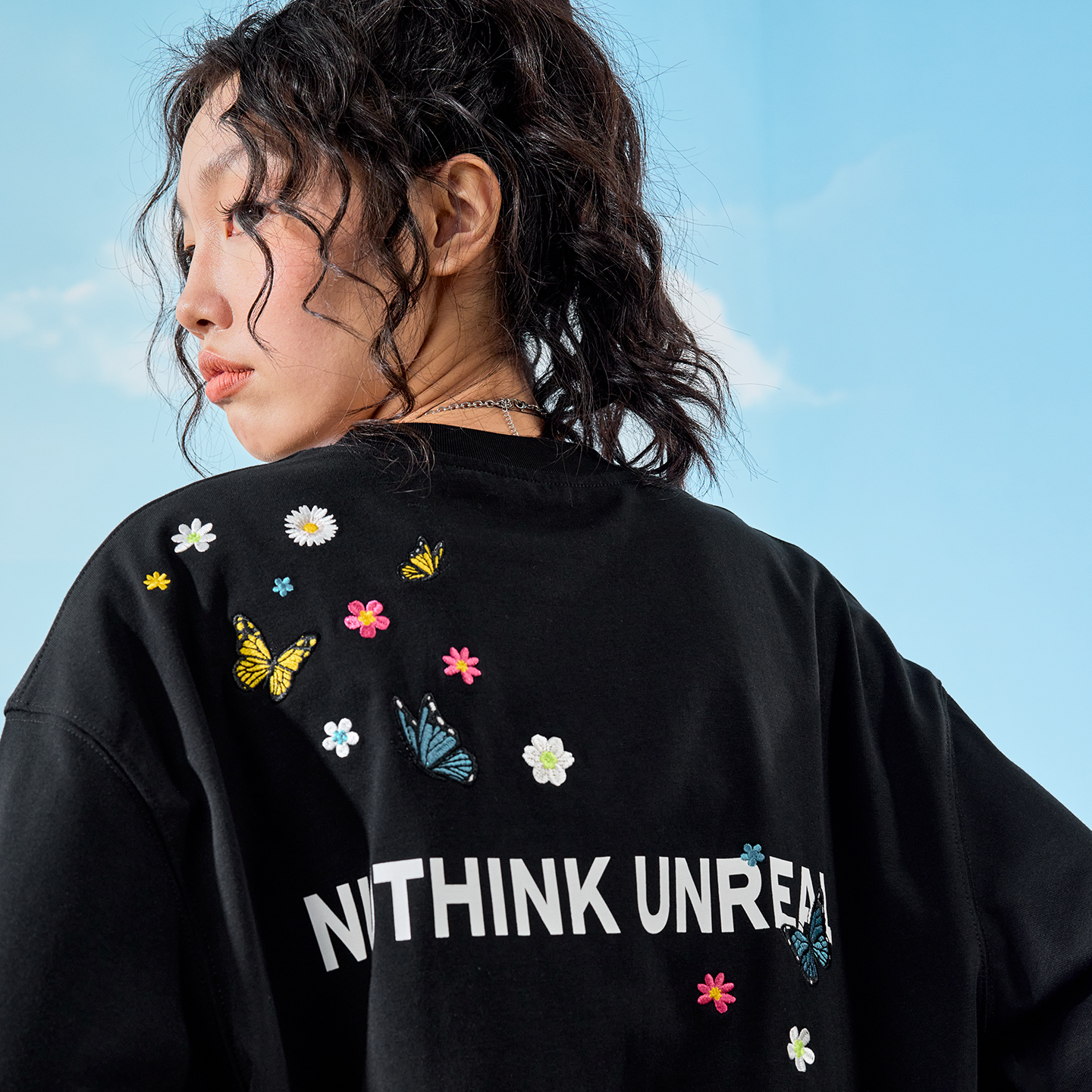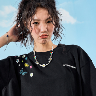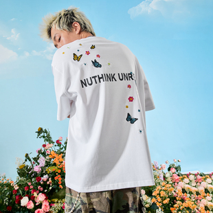 纯棉男女情侣2025夏新款 半袖 T恤美式 Nuthink国潮蝴蝶花卉刺绣短袖