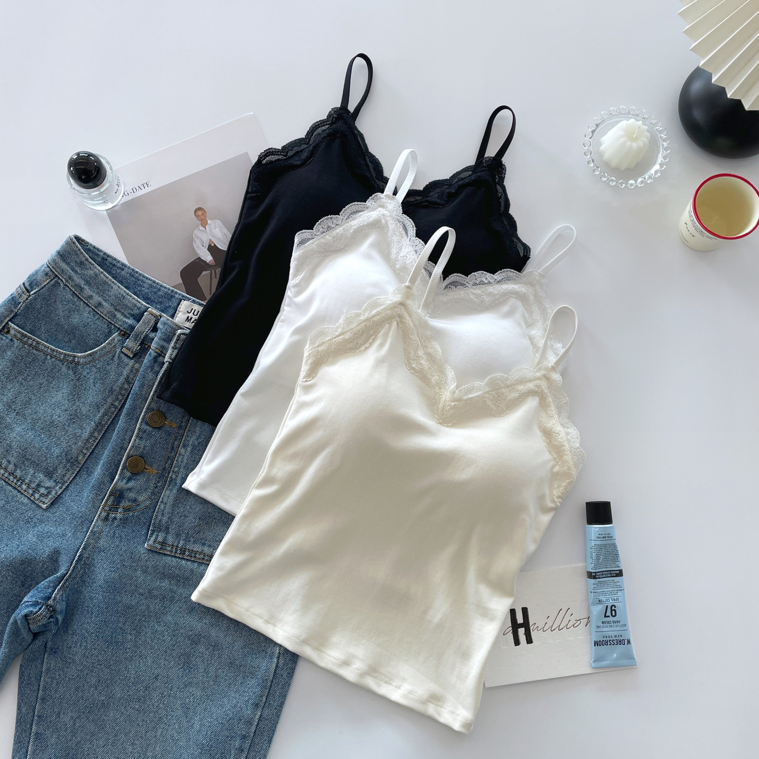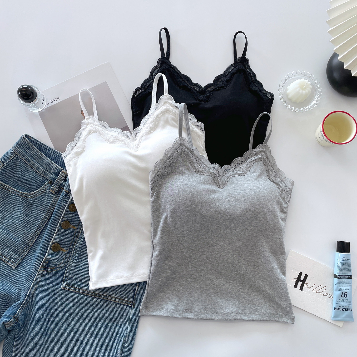 显瘦外穿内搭打底上衣 纯欲性感蕾丝吊带背心女带胸垫修身 夏季 新款