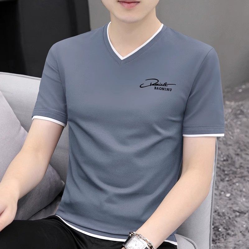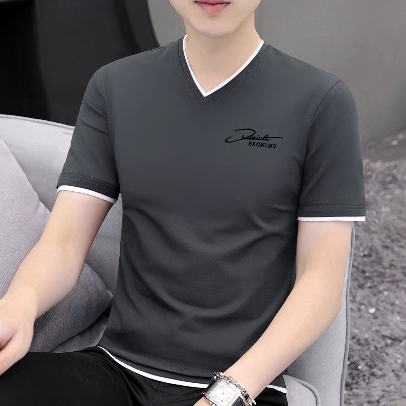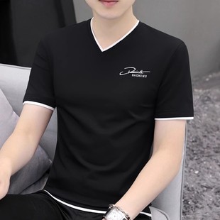 鸡心领拼色半袖 短袖 v领纯棉修身 夏季 桃心领印花上衣 t恤男2025新款