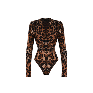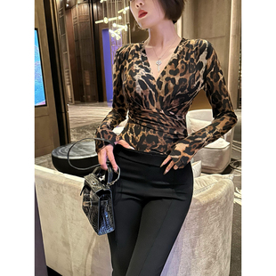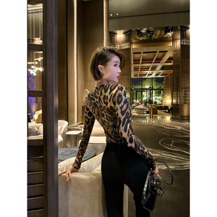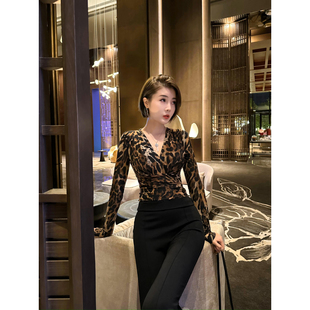 上衣 V领打底衫 XULU原创水晶麻双面豹纹印花长袖 连体衣性感修身